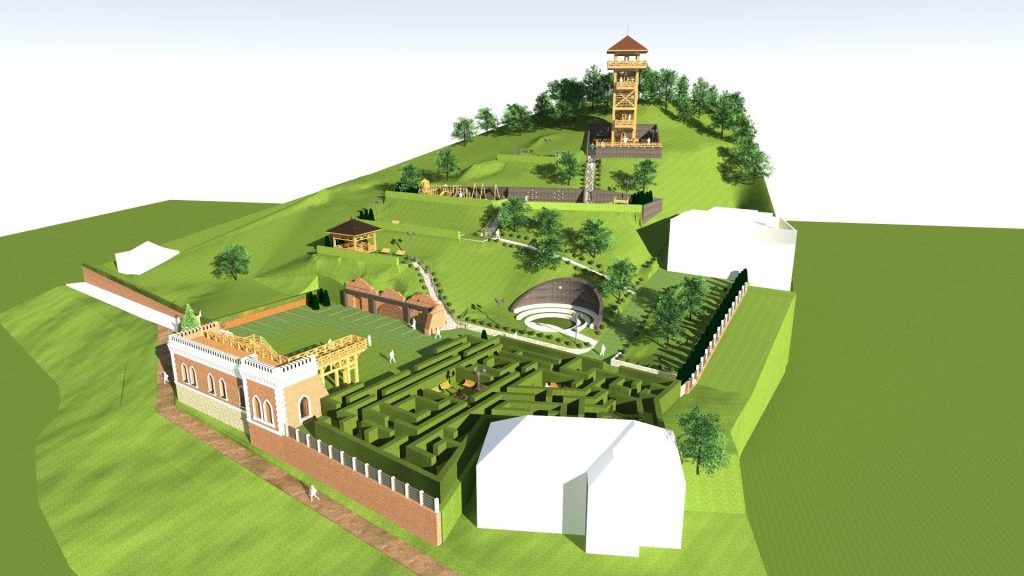 În apropierea centrului va fi amenajată o grădină, prin transformarea terenului degradat și neutilizat din vecinătatea clădirii într-o zonă verde, destinată relaxării. Vor exista locuri de joacă, zone de odihnă, un amfiteatru, un turn de observație, o terasă panoramică și un foișor, iar pentru iubitorii sportului se va amenaja un teren de minigolf, vor fi amplasate mese de șah și aparate pentru exerciții fizice.