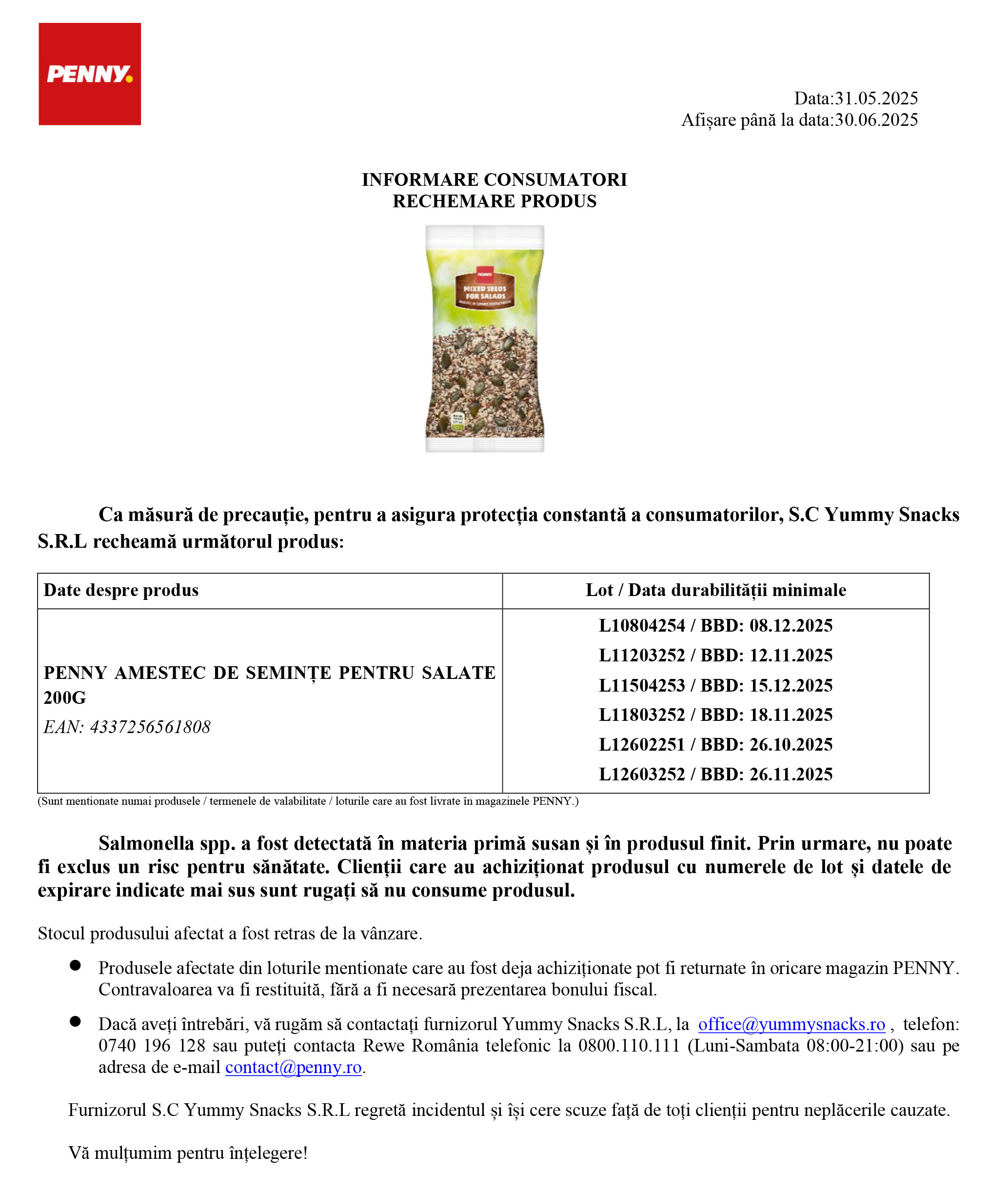 Conform sursei citate, ca măsură de precauţie, pentru a asigura protecţia constantă a consumatorilor, S.C Yummy Snacks S.R.L recheamă şase loturi din produsul vândut sub denumirea ”PENNY AMESTEC DE SEMINŢE PENTRU SALATE 200G”.