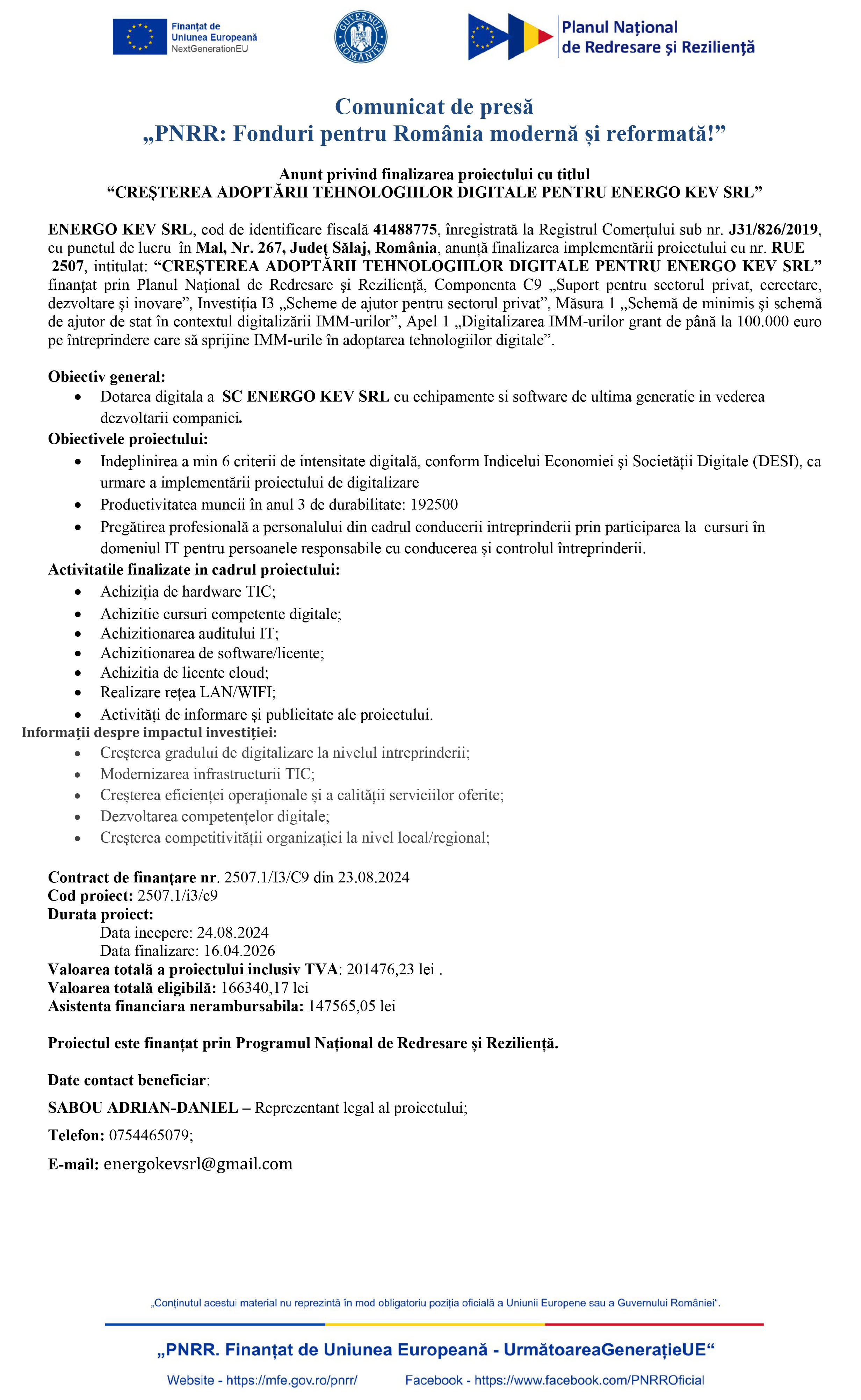 2507, intitulat: “CREȘTEREA ADOPTĂRII TEHNOLOGIILOR DIGITALE PENTRU ENERGO KEV SRL finanţat prin Planul Naţional de Redresare şi Rezilienţă, Componenta C9 „Suport pentru sectorul privat, cercetare, dezvoltare și inovare”, Investiția I3 „Scheme de ajutor pentru sectorul privat”, Măsura 1 „Schemă de minimis și schemă de ajutor de stat în contextul digitalizării IMM-urilor”, Apel 1 „Digitalizarea IMM-urilor grant de până la 100.000 euro pe întreprindere care să sprijine IMM-urile în adoptarea tehnologiilor digitale”.