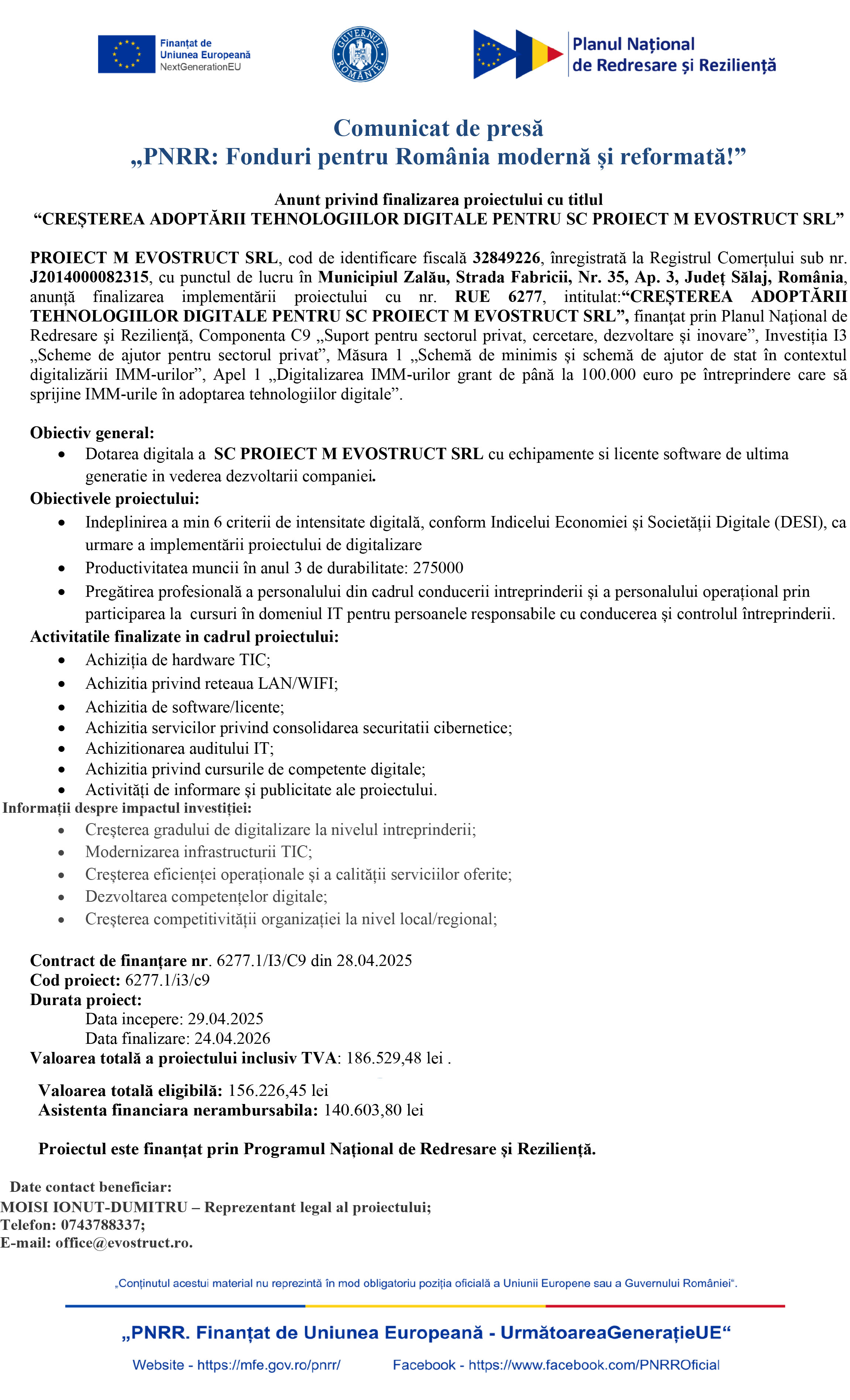 PROIECT M EVOSTRUCT SRL, cod de identificare fiscală 32849226, înregistrată la Registrul Comerțului sub nr. J2014000082315, cu punctul de lucru în Municipiul Zalău, Strada Fabricii, Nr. 35, Ap. 3, Județ Sălaj, România, anunță finalizarea implementării proiectului cu nr. RUE 6277, intitulat:“CREȘTEREA ADOPTĂRII TEHNOLOGIILOR DIGITALE PENTRU SC PROIECT M EVOSTRUCT SRL”, finanţat prin Planul Naţional de
