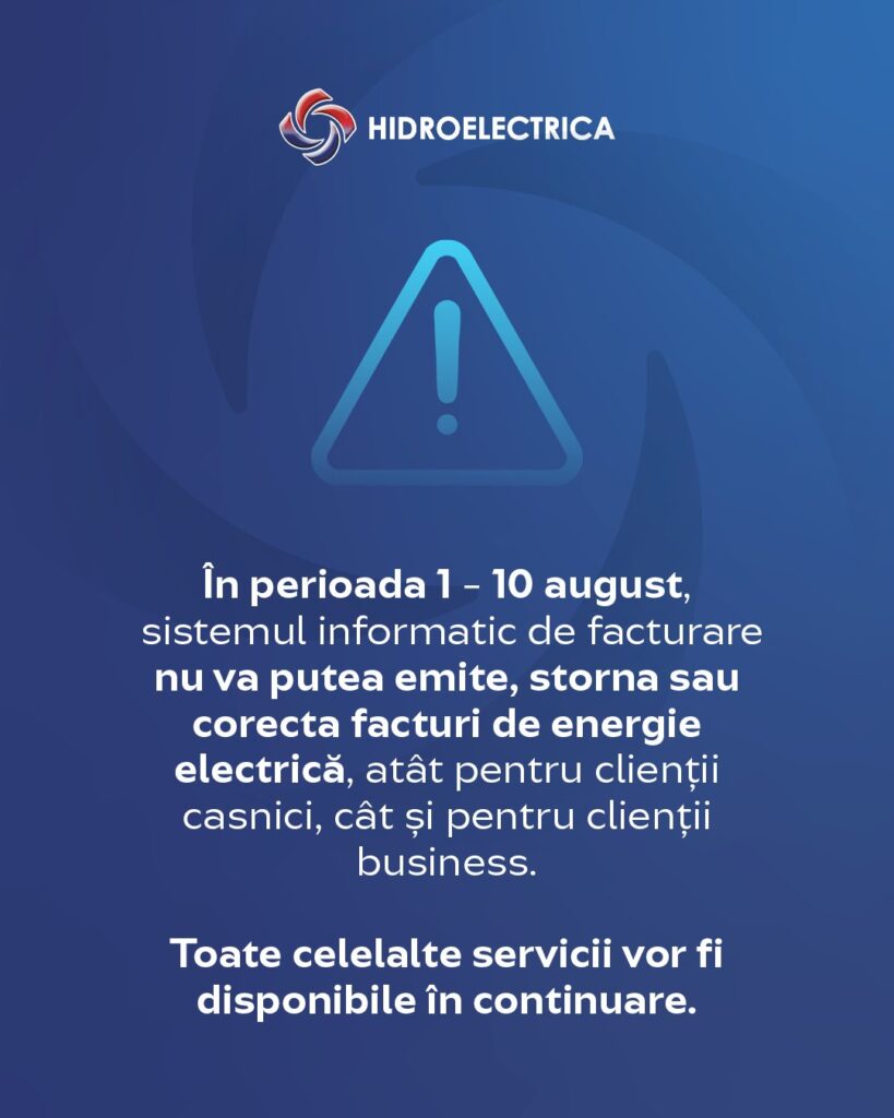 Hidroelectrica, cel mai mare producător de energie electrică din România și furnizor pentru peste 600.000 de clienți casnici, anunţă toţi clienţii casnici că, din cauza modificărilor legislative ce intră în vigoare la 1 august, sistemul informatic al companiei nu va putea emite, storna sau corecta facturile la energie electrică în perioada 1 – 10 august 2025.