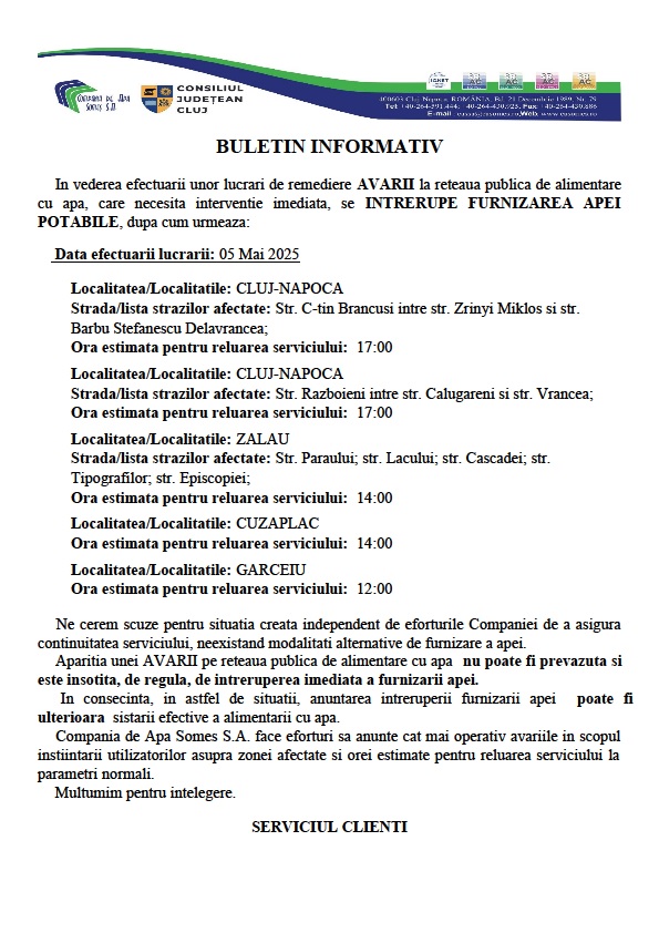 Printr-un buletin informativ transmis de Compania de Apă Somes SA suntem informați cu privire la faptul că: „În vederea efectuarii unor lucrari de remediere AVARII la reteaua publica de alimentare cu apa, care necesita interventie imediata, se INTRERUPE FURNIZAREA APEI POTABILE, dupa cum urmeaza: