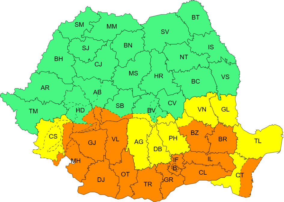 Pentru mai multe județe din țară au fost emise avertizări meteorologice cod galben sau cod portocaliu de ploi însemnate cantitativ și intensificări puternice ale vântului.