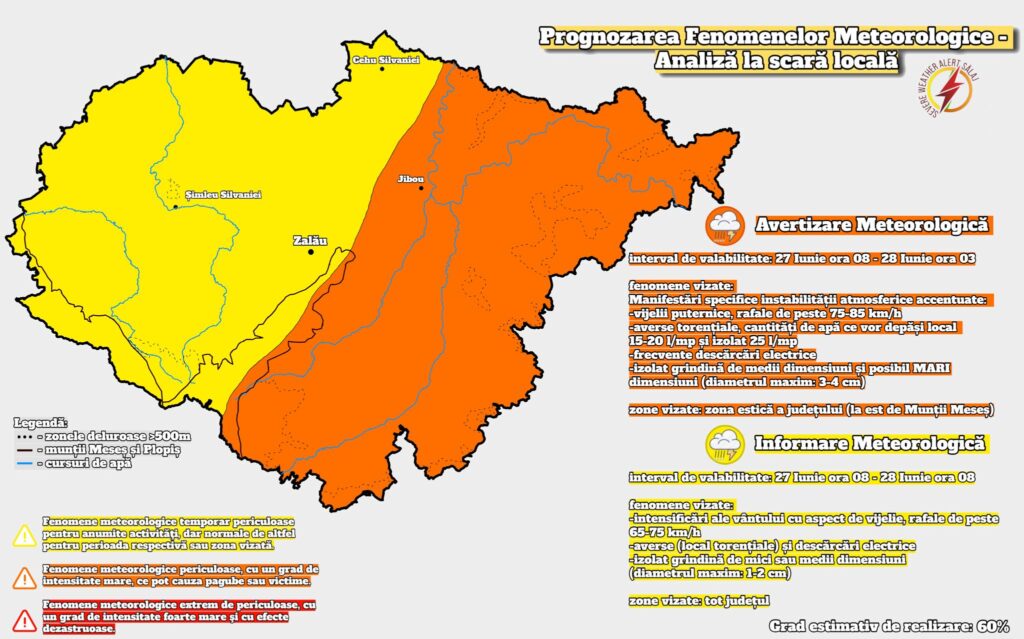 Meteorologii de la Severe Weather Alert – Sălaj atrag atenţia supra faptului că în intervalul: 27 Iunie ora 08 – 28 Iunie ora 03, în jumătatea estică a județului (la est de Munții Meseș), instabilitatea atmosferică va fi accentuată, prin urmare se vor semnala averse torențiale, însoțite de frecvente descărcări electrice, vijelii (rafale de peste 75-85 km/h), și izolat grindină de medii sau posibil MARI dimensiuni (diametrul maxim 3-4 cm)