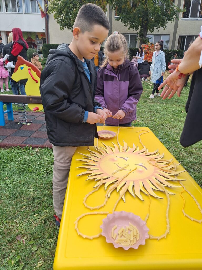 În curtea grădiniței, educatoarele au amenajat și organizat diferite centre de lucru, sub forma unor ateliere, unde copiii au descoperit, au experimentat și au creat, din diverse materiale, lucrări artistice specifice toamnei.