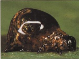 Adultul are corpul alungit de culoare albastră – verzuie, capul și antenele fiind negre. Lungimea corpului este de 4,5-5,5 mm. Larvă are la maturitate corpul bombat, culoarea albă-gălbuie, iar capul este brun. Corpul are lungimea de 5-7 mm. Dorsal corpul larvei este acoperit de o mantie formată din mucilagii și excremente. Iernează că adult în frunzarul pădurilor, pe sub ierburi, în sol. Când temperatura medie atinge 9-10ºC apar adulții care rod frunzele plantelor tinere. Rosaturile cuprind ambele epiderme și au un aspect ferastruit. Larvele produc rosaturi numai pe partea superioară a frunzei ( epiderma și parenchimul ), epiderma inferioară rămâne în majoritatea cazurilor intactă. Atacul are loc de obicei în vetre, care se măresc pe măsură ce larvele se dezvoltă. Frunzele atacate se ingalbenesc și se usucă. De la depărtare culturile de cereale atacate apar cu vetre inalbite.