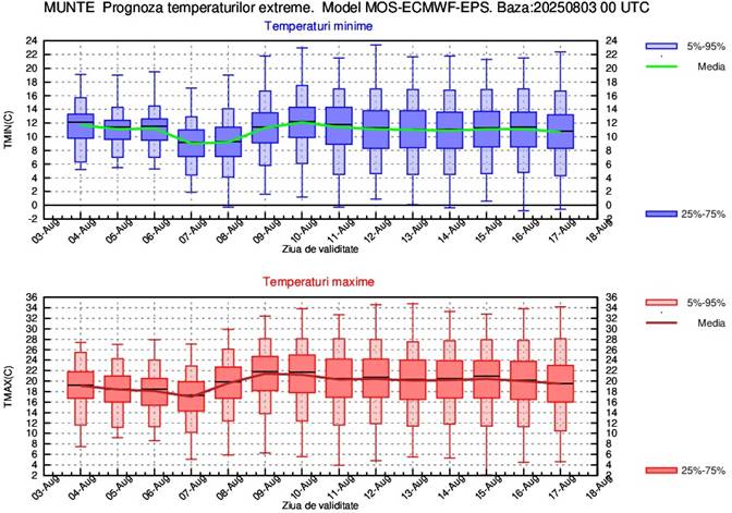 La începutul intervalului media maximelor va fi de 18…20 de grade, apoi cu ușoare variații de la o zi la alta, în perioada 8-17 august va fi de 20…22 de grade, cele mai mari valori urmând a se înregistra în zilele de 9 și 10 august. Temperaturile minime se vor situa în medie în jurul valorii de 12 grade la începutul intervalului, apoi vor scădea până spre 10 grade în nopțile de 7 și 8 august. Ulterior nopții de 9 august și până la sfârșitul intervalului, variațiile termice vor fi nesemnificative, media minimelor urmând a fi de 10…12 grade.
