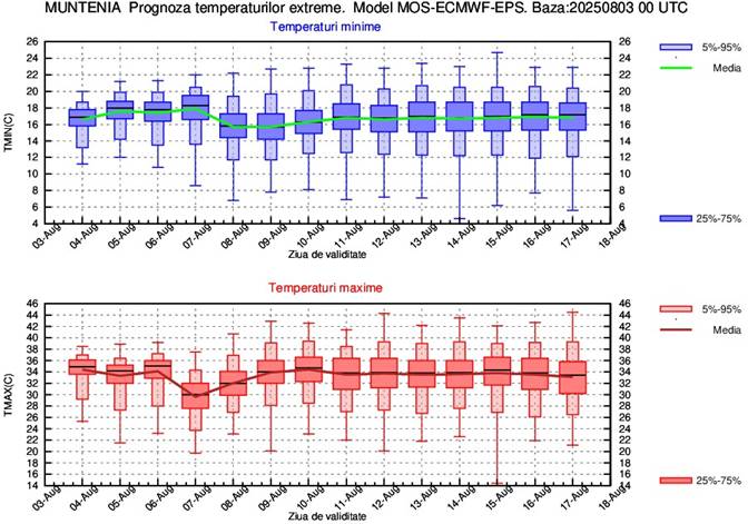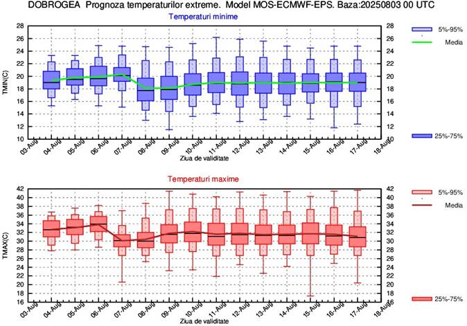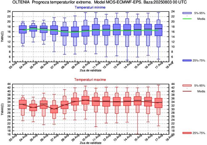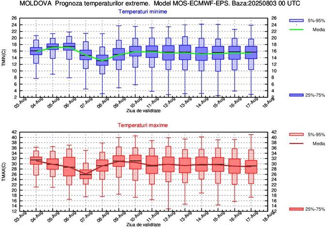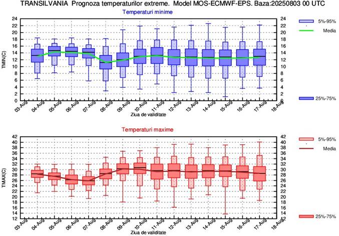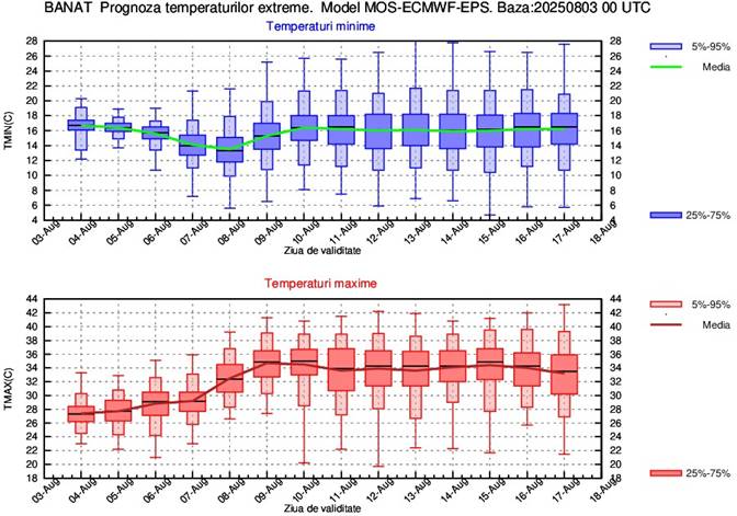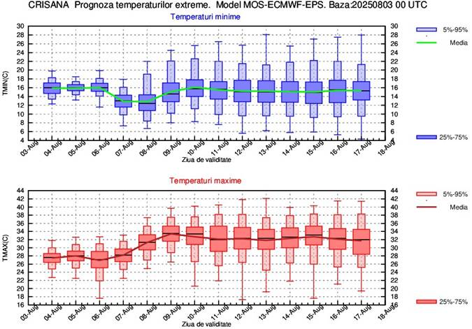 În perioada 4-8 august vor fi ușoare alternanțe termice de la o zi la alta, astfel că media temperaturilor maxime va fi de 30…33 de grade, cele mai mari valori urmând a se înregistra în zilele de 4 și 6 august. Din 9 august și până la sfârșitul intervalului de prognoză media maximelor va fi de 34…35 de grade. Media temperaturilor minime pe parcursul celor 2 săptămâni de prognoză va fi de 17…18 grade.
