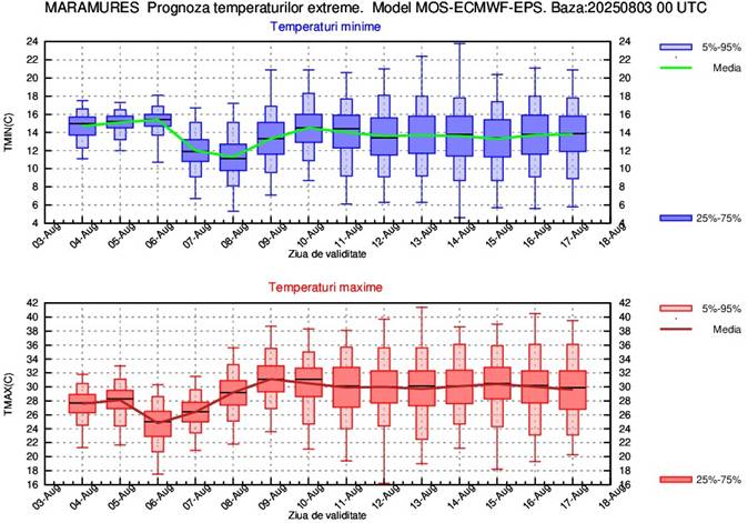 La începutul intervalului media maximelor va fi de 28 de grade, apoi va scădea spre valori în jurul a 25 de grade în ziua de 6 august. După ziua de 6 august, vremea se va încălzi, astfel încât în zilele de 9 și 10 august media maximelor va fi de 30…31 de grade. În perioada 10-17 august variațiile termice vor fi nesemnificative de la o zi la alta, astfel că media temperaturilor maxime va fi în jurul a 30 de grade. Temperaturile minime se vor situa în medie în jurul valorii de 15 grade la începutul intervalului, vor scădea până spre 11 grade în noaptea de 8 august, apoi vor crește spre valori de 14…15 grade până în noaptea de 11 august. Ulterior datei de 11 august și până la sfârșitul intervalului media minimelor va fi de 14 grade.