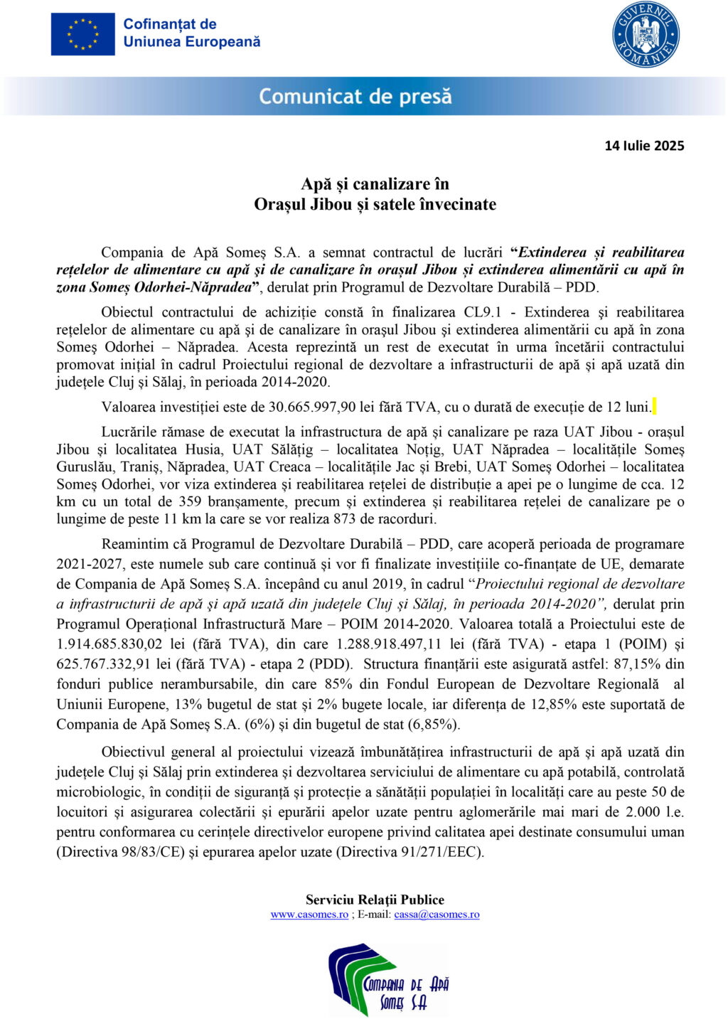 COMUNICAT DE PRESĂ: Apă și canalizare în Orașul Jibou și satele învecinate