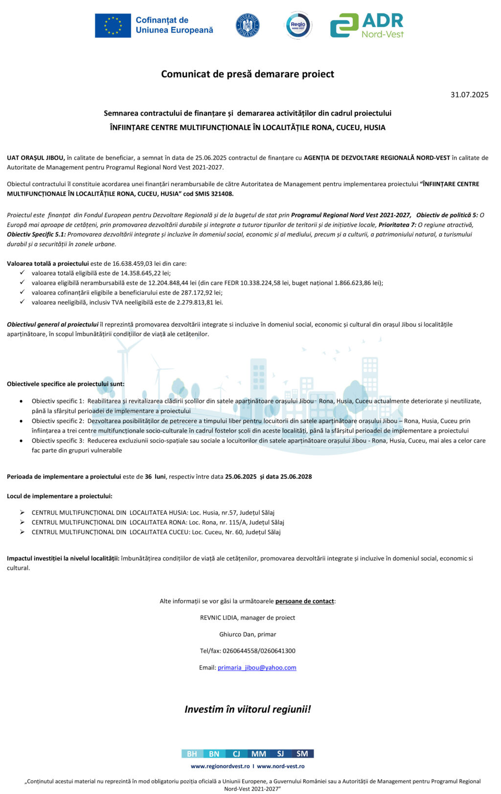 UAT ORAȘUL JIBOU, în calitate de beneficiar, a semnat în data de 25.06.2025 contractul de finanțare cu AGENȚIA DE DEZVOLTARE REGIONALĂ NORD-VEST în calitate de Autoritate de Management pentru Programul Regional Nord Vest 2021-2027.
