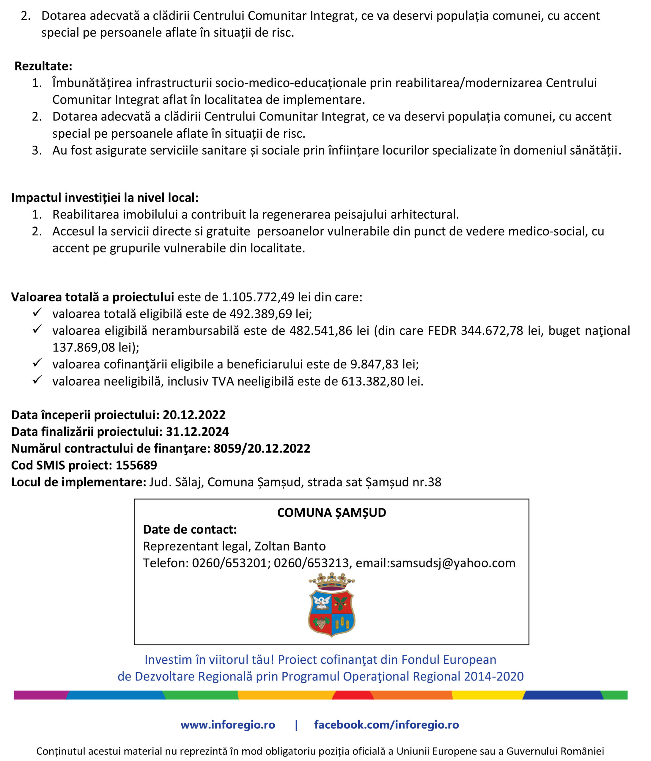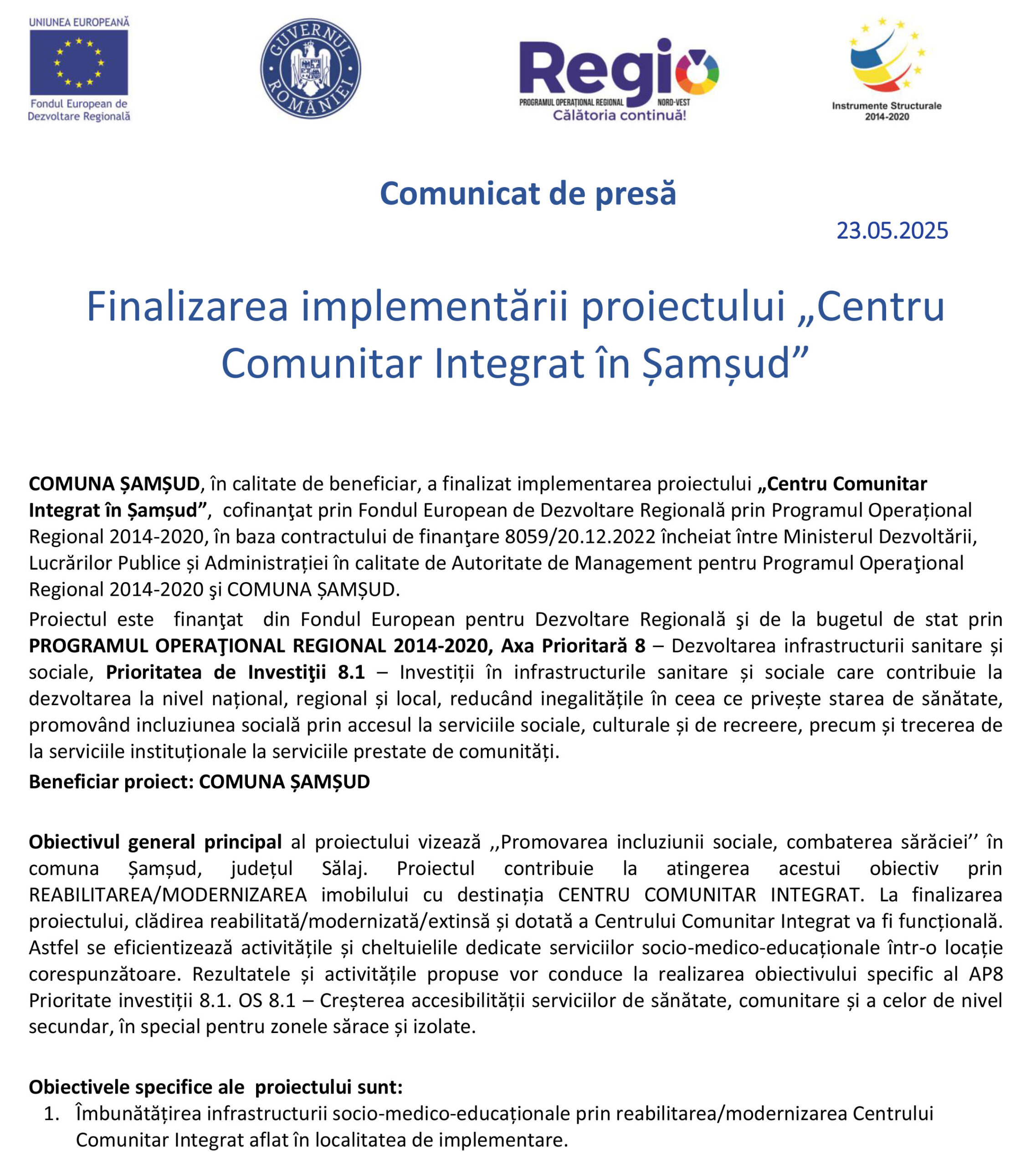 Economic Comunicat de presă: Finalizarea implementării proiectului „Centru Comunitar Integrat în Șamșud” Redacția mai 23, 2025 Post Views: 66 Share Messenger Whatsapp Post navigation Previous: PSD solicită un dialog constructiv cu președintele României și celelalte forțe politiceNext: Zalău: Începe agitația pentru a prinde locuri la creșă sau la grădiniță Mai multe… Actualitate Economic Featured CCR dă undă verde la scumpiri: impozite mai mari pentru locuințe, mașini și câștiguri din bursă și criptomonede S. Olaru decembrie 11, 2025 Economic Featured Guvernul schimbă regulile colaborării cu OMV Petrom. Ce câștigă românii? Alina Rad decembrie 10, 2025 Actualitate Economic Featured Sălajul, campionul naţional al creşterilor salariale în 2025. Singura majorare de două cifre S. Olaru decembrie 10, 2025