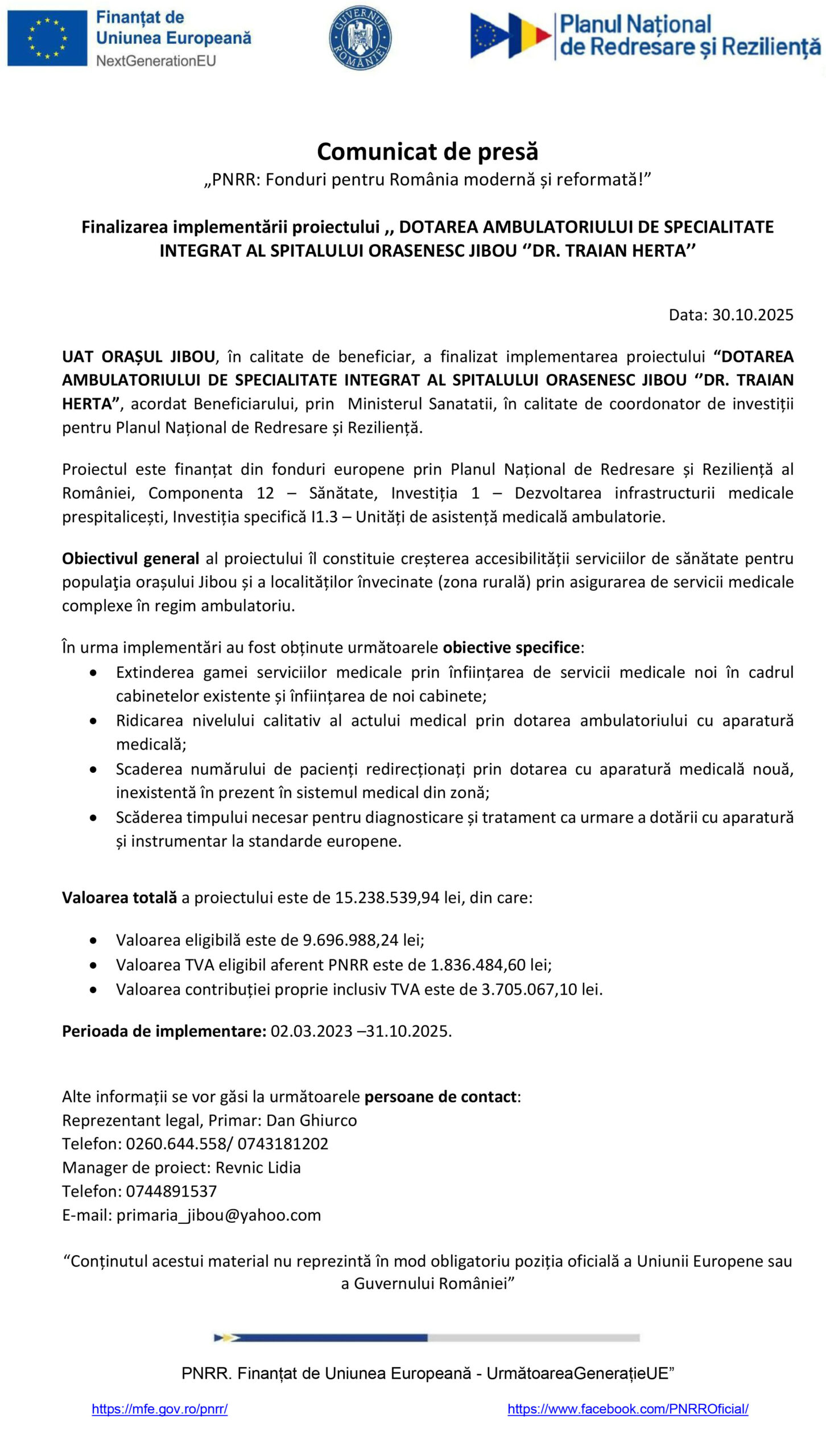 Comunicat de presă: Finalizarea implementării proiectului ,, DOTAREA AMBULATORIULUI DE SPECIALITATE INTEGRAT AL SPITALULUI ORĂȘENESC JIBOU „DR. TRAIAN HERȚA’’
