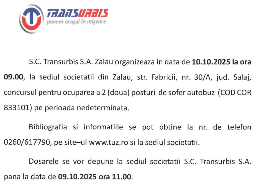 S.C. Transurbis S.A. Zalau organizeaza in data de 10.10.2025 la ora 09.00, la sediul societatii din Zalau, str. Fabricii, nr. 30/A, jud. Salaj, concursul pentru ocuparea a 2 (doua) posturi de safer autobuz (COD COR 833101) pe perioada nedeterminata.