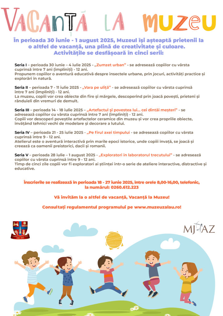 Înscrierile pentru „Vacanţă la Muzeu 2025” încep miercuri, 18 iunie 2025, la ora 08,00 şi se desfăşoară până în 27 iunie, în intervalul orar 8,00–16,00, doar telefonic, la numărul: 0260.612.223.