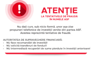 Autoritatea de Supraveghere Financiară (ASF) atrage atenţia publicului să nu dea curs, sub nicio formă, unor propuneri telefonice de investiţii...