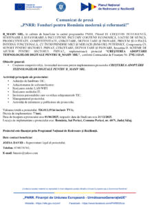 Comunicat de presă „PNRR: Fonduri pentru România modernă și reformată!” B_MASIV SRL, în calitate de beneficiar în cadrul programului PNRR,...