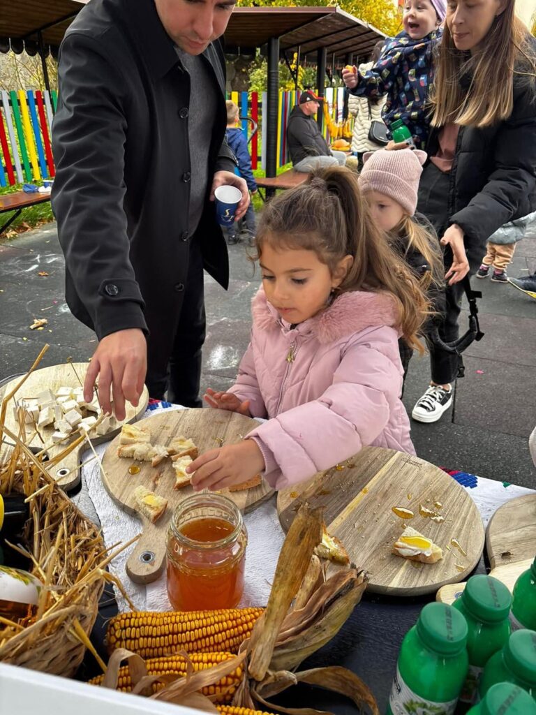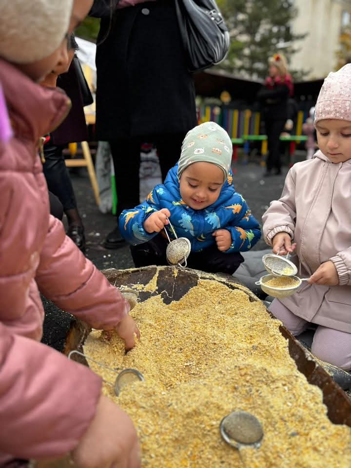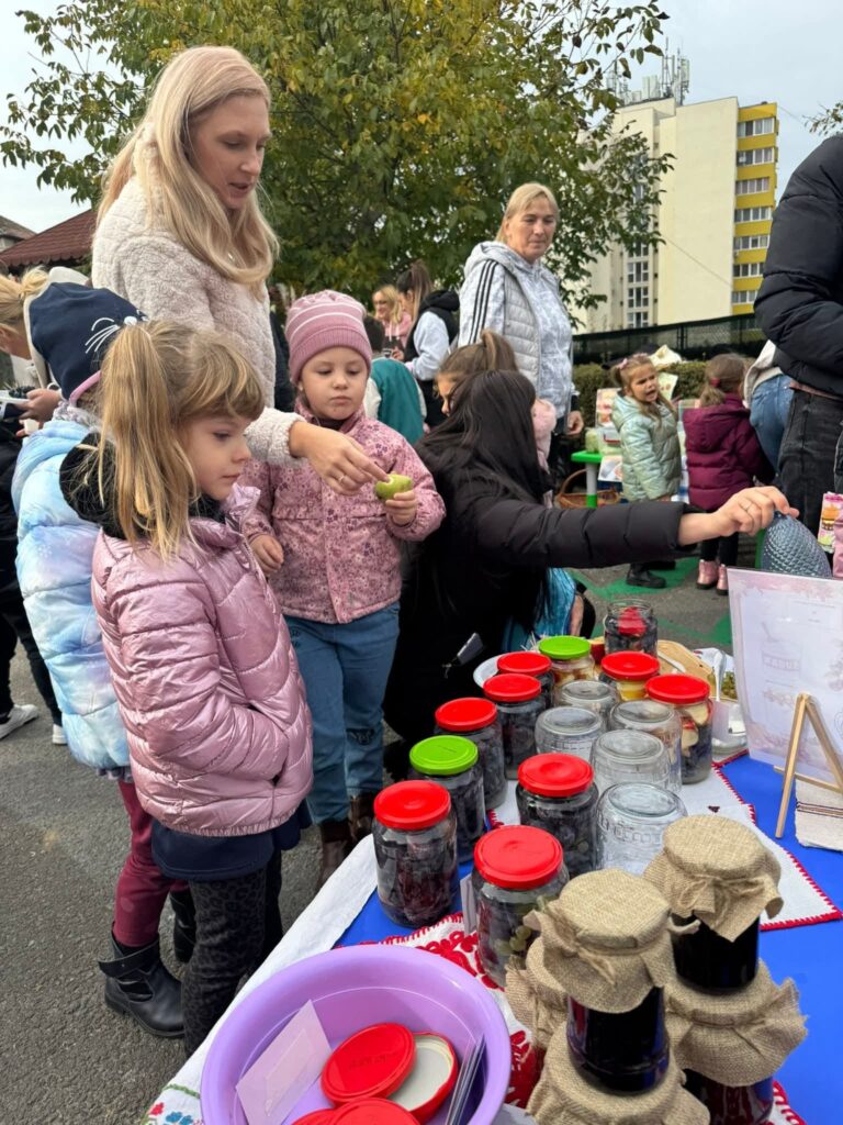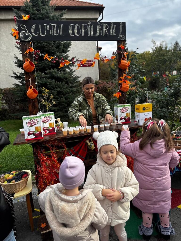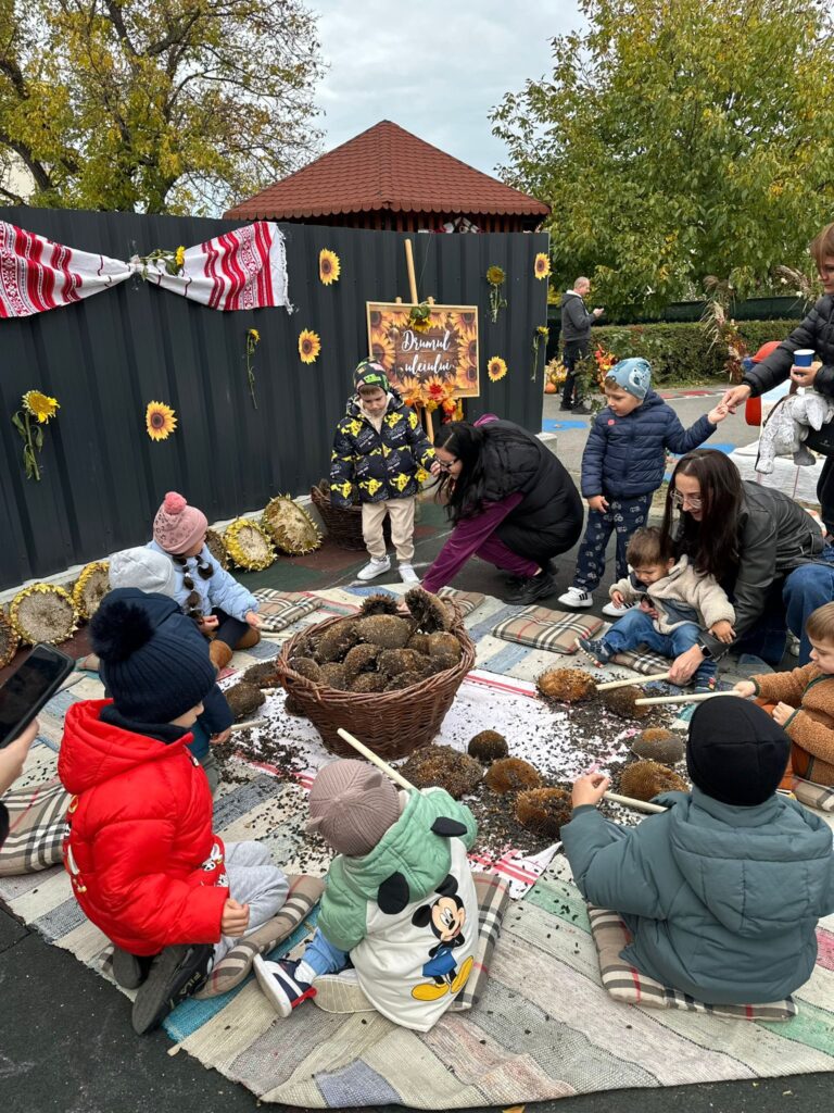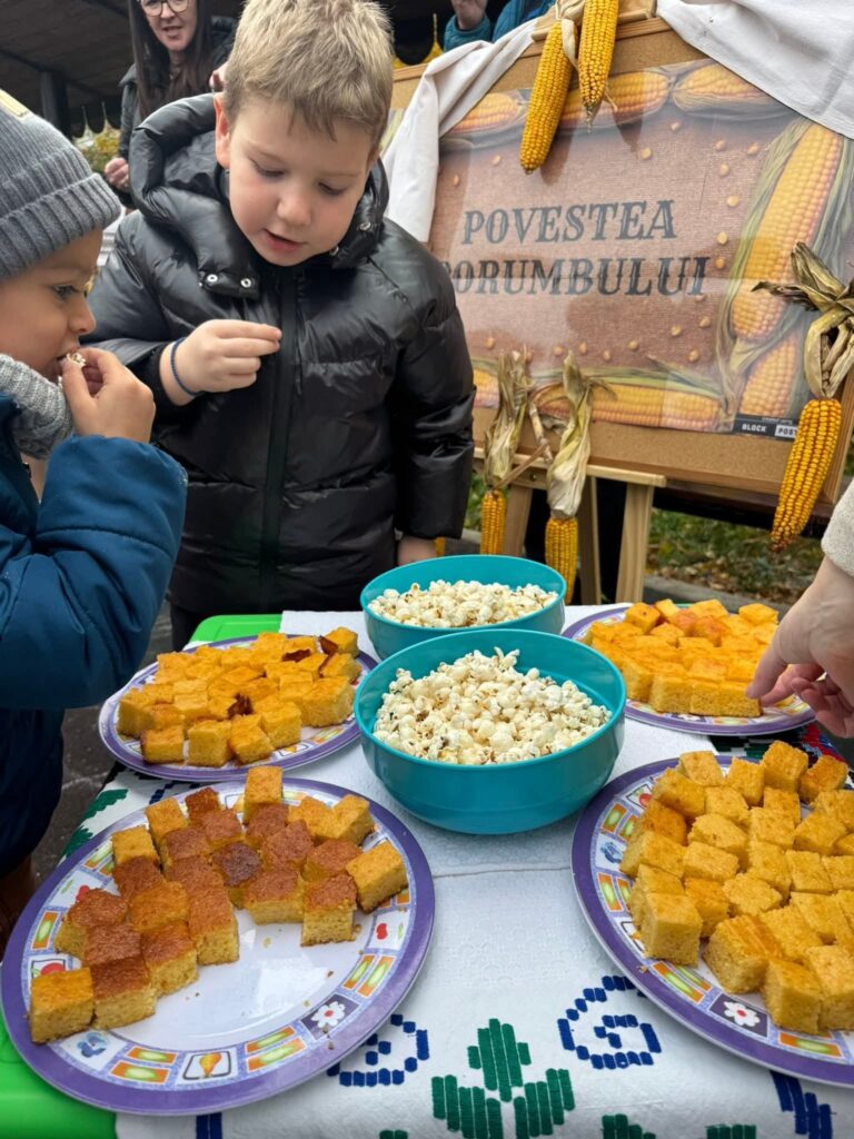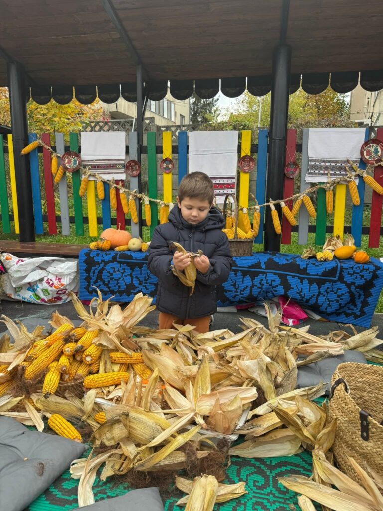 Copiii au descoperit, prin joacă, Povestea porumbului – au frecat știuleți, au desenat în făină de mălai, au construit căsuțe din coceni, au hrănit animale și au gustat bunătăți tradiționale: popcorn, prăjitură cu mălai și mămăligă delicioasă! De la floarea-soarelui, au învățat drumul uleiului — au bătut florile pentru semințe, au decorat crafturi pline de culoare și au savurat pâine cu ulei, așa cum făceau odinioară bunicii. În colțul plin cu arome de fructe și legume, micii gospodari au pus compot și murături, au decorat fructe și legume și s-au bucurat de gustul dulce al sucului de mere.