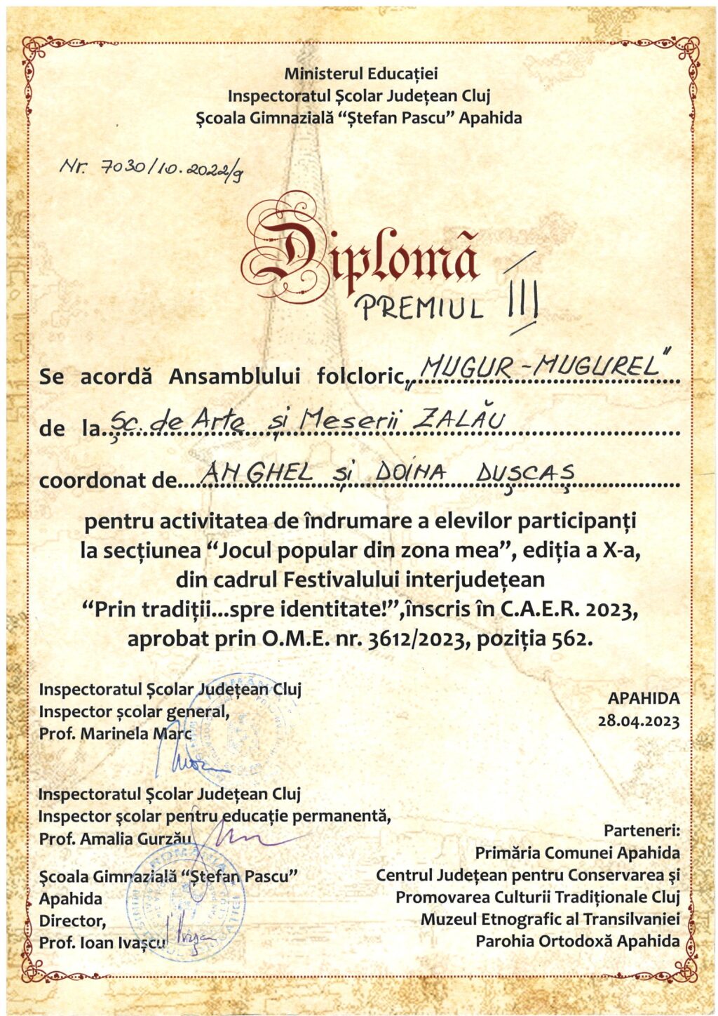 Ansamblul Folcloric „Mugur, mugurel” (coordonat de coregrafii Doina și Anghel Dușcaș) al Școlii Populare de Arte și Meserii a primit Premiul III la secțiunea „Jocul popular din zona mea” în cadrul Festivalului interjudețean „Prin tradiții… spre identitate!”, organizat de Școala Gimnazială „Ștefan Pascu” Apahida și Inspectoratul Școlar Județean Cluj. Ediția a X-a a festivalului înscris în Calendarul Activităților Educative Regionale și Interjudețene din anul școlar 2022-2023, aprobat de Ministerul Educației, a avut loc în 28 aprilie 2023.