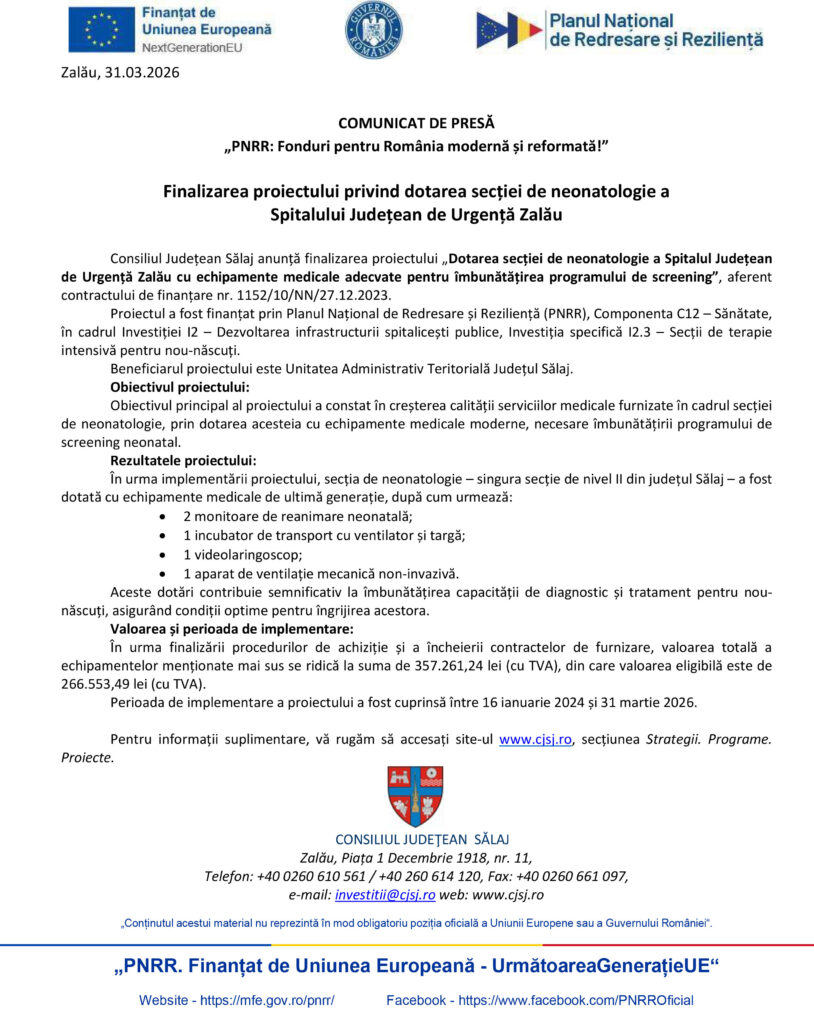 Consiliul Județean Sălaj anunță finalizarea proiectului „Dotarea secției de neonatologie a Spitalul Județean de Urgență Zalău cu echipamente medicale adecvate pentru îmbunătățirea programului de screening”, aferent contractului de finanțare nr. 1152/10/NN/27.12.2023.