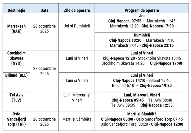 Zborurile spre destinațiile Marrakesh și Oslo Sandefjord Torp sunt operate în premieră absolută pe aeroportul clujean, iar referitor la zborurile spre Stockholm Skavsta, Billund și Tel Aviv, aceastea au mai fost operate în anii trecuți.