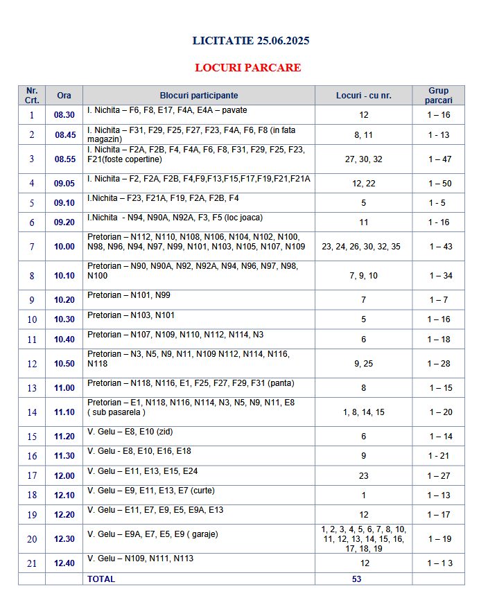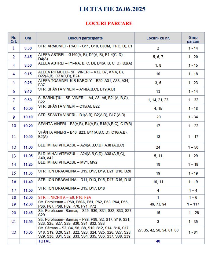Ultima zi de înscriere la licitații este data de 24 iunie, ora 13.00, și vizează următoarele străzi: 25 iunie- Ioan Nechita, Pretorian, Voievodul Gelu; 26 iunie – Armoniei, Aleea Astrei, Simion Bărnuțiu, Sfânta Vineri, Bulevardul Mihai Viteazul, Ioan Dragalina, Ioan Nechita, Porolissum, Sărmaș.