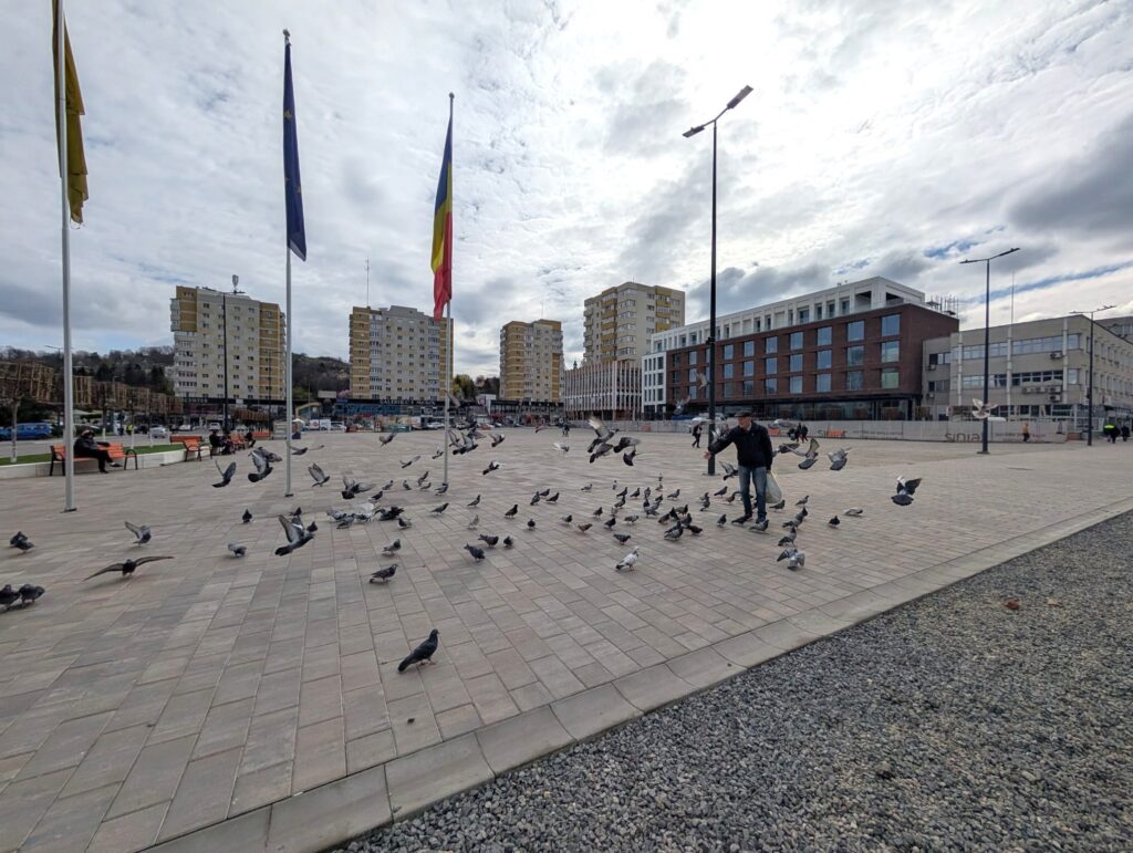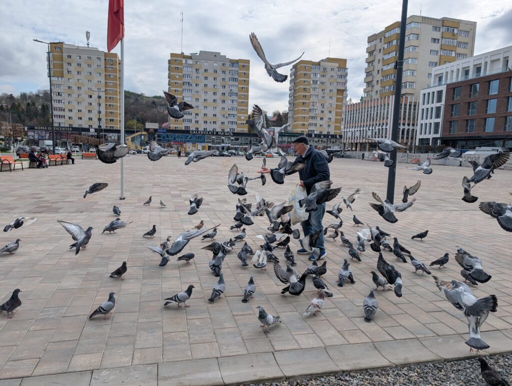 Ne intersectăm adeseori în zona centrală a oraşului. Merge puţin adus de spate şi, mai mereu, poartă în mână o pungă de plastic. E imposibil să-i ignori prezenţa pentru că e însoţit, la fiecare pas, de un adevărat “nor” de porumbei ce zboară împrejurul său. Porumbeii îl aşteaptă la ieşirea din scara blocului în care locuieşte şi îl însoţesc până la staţia de unde ia autobuzul cu care merge la terenul pe care îl are undeva la marginea oraşului. Acolo, porumbeii sunt prezenţi din nou.