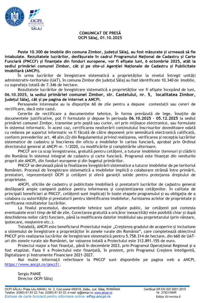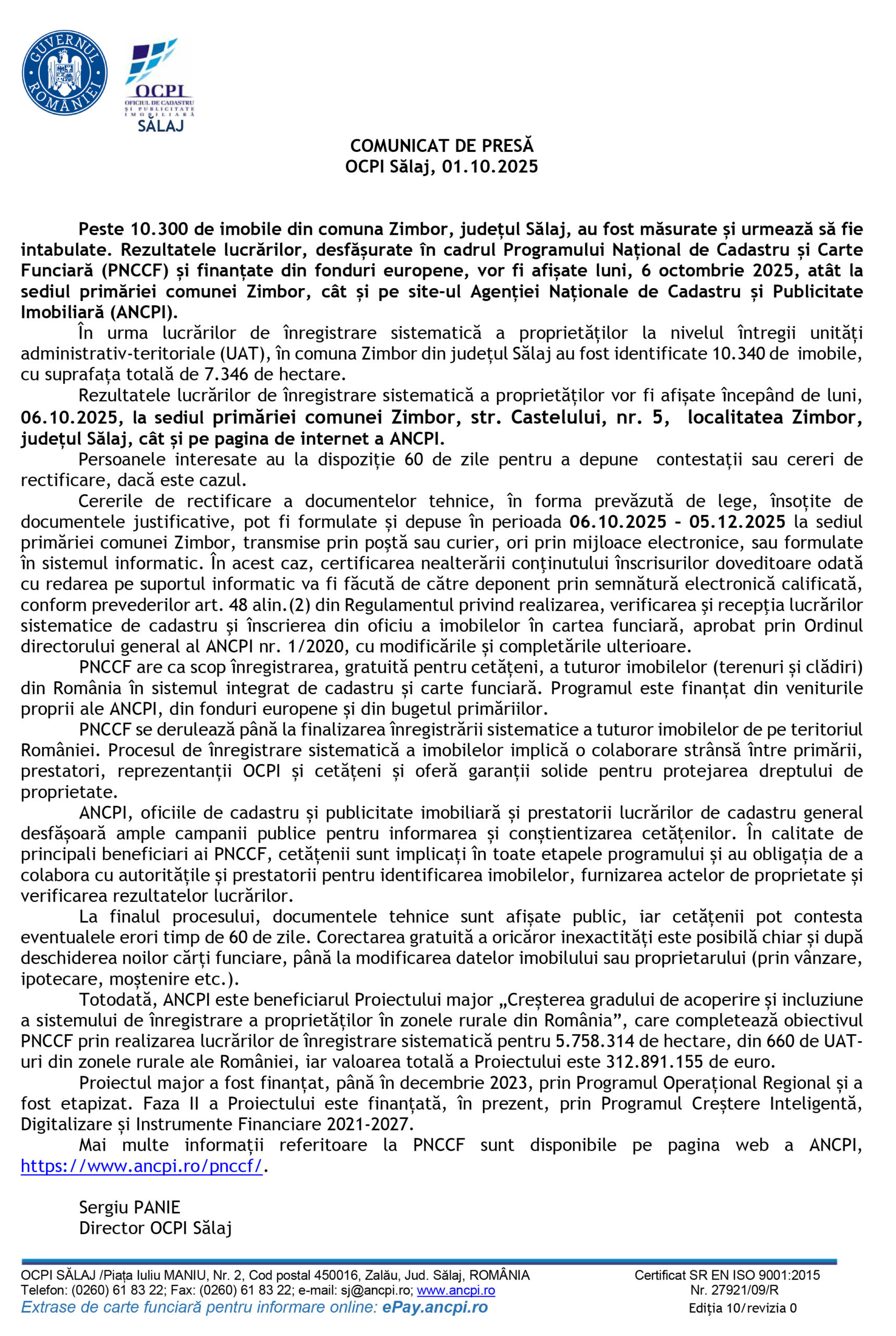 Rezultatele lucrărilor de înregistrare sistematică a proprietăților vor fi afișate începând de luni, 06.10.2025, la sediul primăriei comunei Zimbor, str. Castelului, nr. 5, localitatea Zimbor, județul Sălaj, cât și pe pagina de internet a ANCPI.