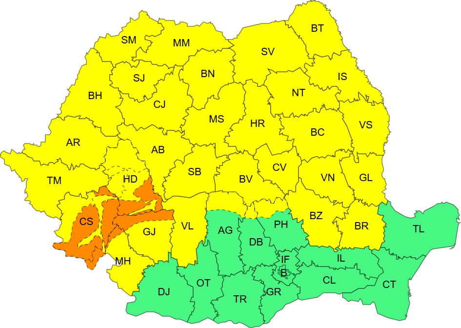 A fost emisă, de asemenea, o atenționare cod portocaliu, valabilă până în data de 6 ianuarie, la ora 10.00, pentru zona de munte a județelor Caraș-Severin, Mehedinți, Gorj și Hunedoara, unde, îndeosebi la altitudini de peste 1400 m, va continua să ningă temporar abundent, iar stratul de zăpadă nou depus va fi de 20…30 cm (echivalent în apă de 20…30 l/mp). În zona înaltă vor fi rafale de 80…90 km/h, va fi viscol puternic și vizibilitate redusă.
