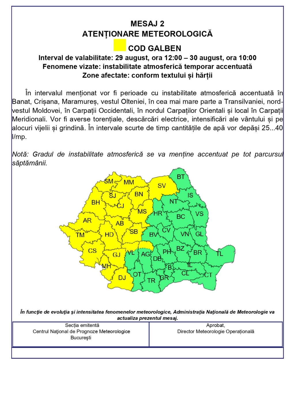 Potrivit ANM, Banat, Crișana, Maramureș, vestul Olteniei, cea mai mare parte a Transilvaniei, nord-vestul Moldovei, Carpații Occidentali, nordul Carpaților Orientali și, local, Carpații Meridionali sunt zonele aflate sub alertă meteo de instabilitate atmosferică accentuată.