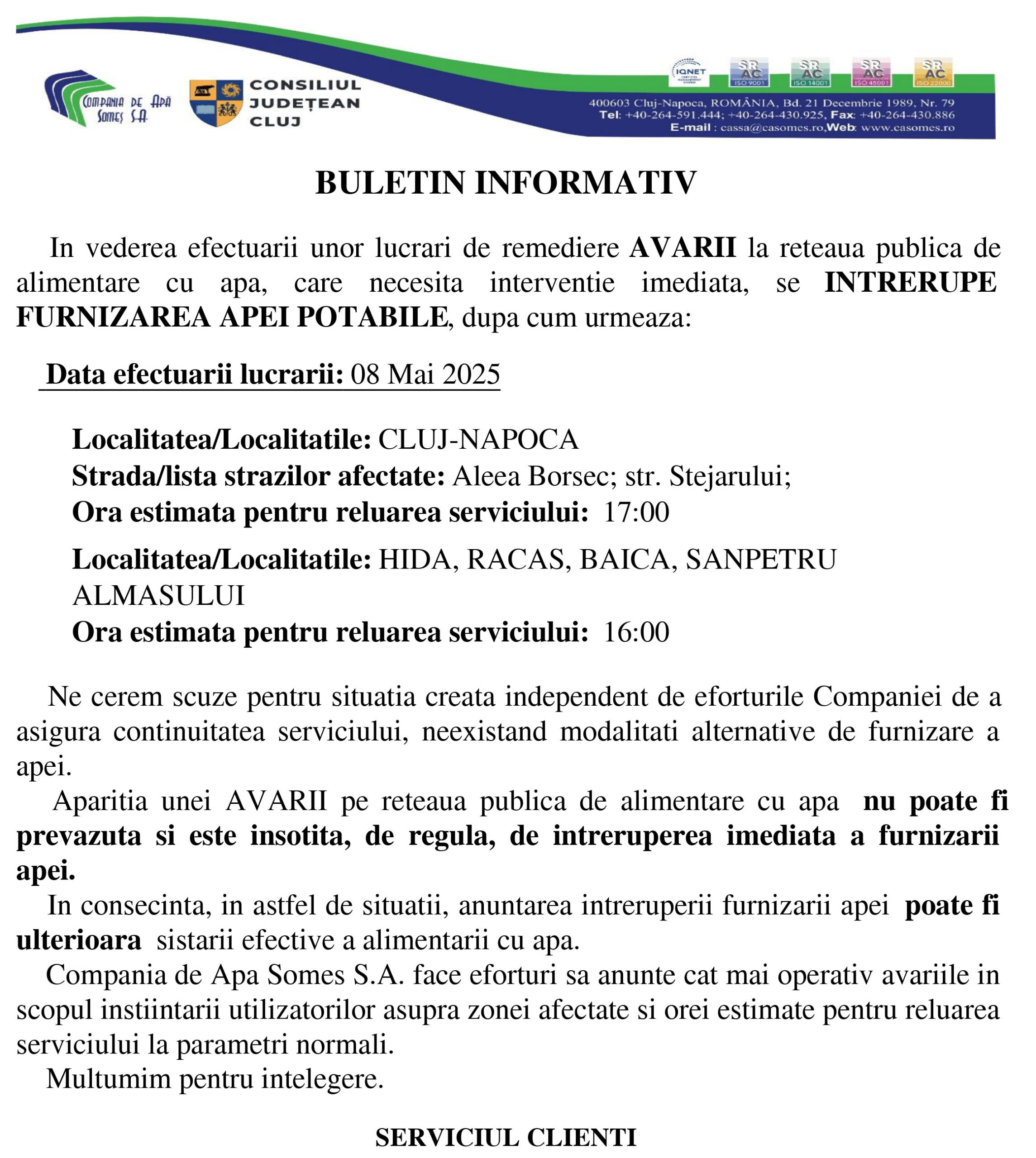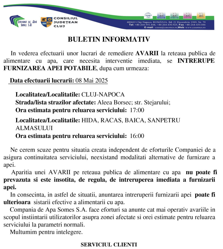 Compania de Apa Somes S.A. face eforturi sa anunte cat mai operativ avariile in scopul instiintarii utilizatorilor asupra zonei afectate si orei estimate pentru reluarea serviciului la parametri normali.
