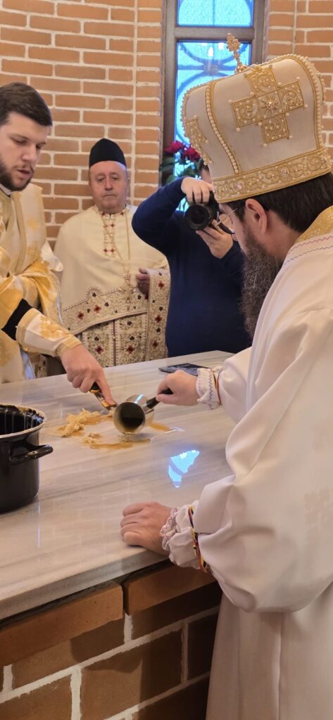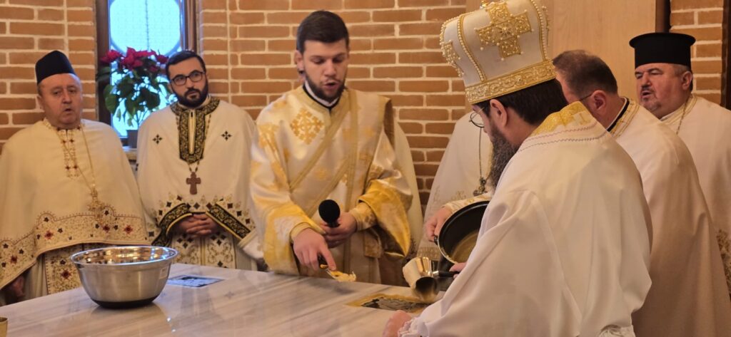 Sfințirea a continuat cu oficierea Sfintei Liturghii care a fost celebrată în partea de sus a bisericii, moment de apoteoză și încununare a întregului eveniment. Fiind și Sărbătoarea Sfântului Arhidiacon Ștefan, primul martir creștin, Preasfințitul Benedict a vorbit despre trăirea eroică a acestui mucenic, despre exemplul său de iubire, iertare și smerenie, invitându-ne să-i slujim lui Dumnezeu ”fără dubii, fără sincope, fără măsură și în orice condiții”. Ierarhul a subliniat din nou importanța împărtășirii cu Trupul și Sângele Mântuitorului, ca sursă deplină de vindecare și vitalitate.