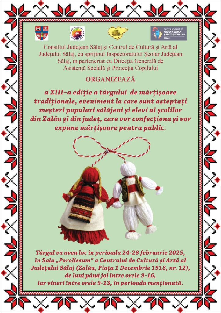 Consiliul Județean Sălaj și Centrul de Cultură şi Artă al Judeţului Sălaj, cu sprijinul Inspectoratului Școlar Județean Sălaj, în parteneriat cu Direcția Generală de Asistență Socială și Protecția Copilului Sălaj, organizează în perioada 24-28 februarie 2025, a XIII-a ediţie a târgului de mărţişoare tradiționale, eveniment la care sunt aşteptaţi meşteri populari sălăjeni şi elevi ai şcolilor din Zalău şi din judeţ, care vor confecţiona şi vor expune mărţişoare pentru public. Târgul va avea loc în Sala „Porolissum” a Centrului de Cultură şi Artă al Judeţului Sălaj (Zalău, Piața 1 Decembrie 1918, nr. 12), de luni până joi între orele 9-16, iar vineri între orele 9-13, în perioada menționată.