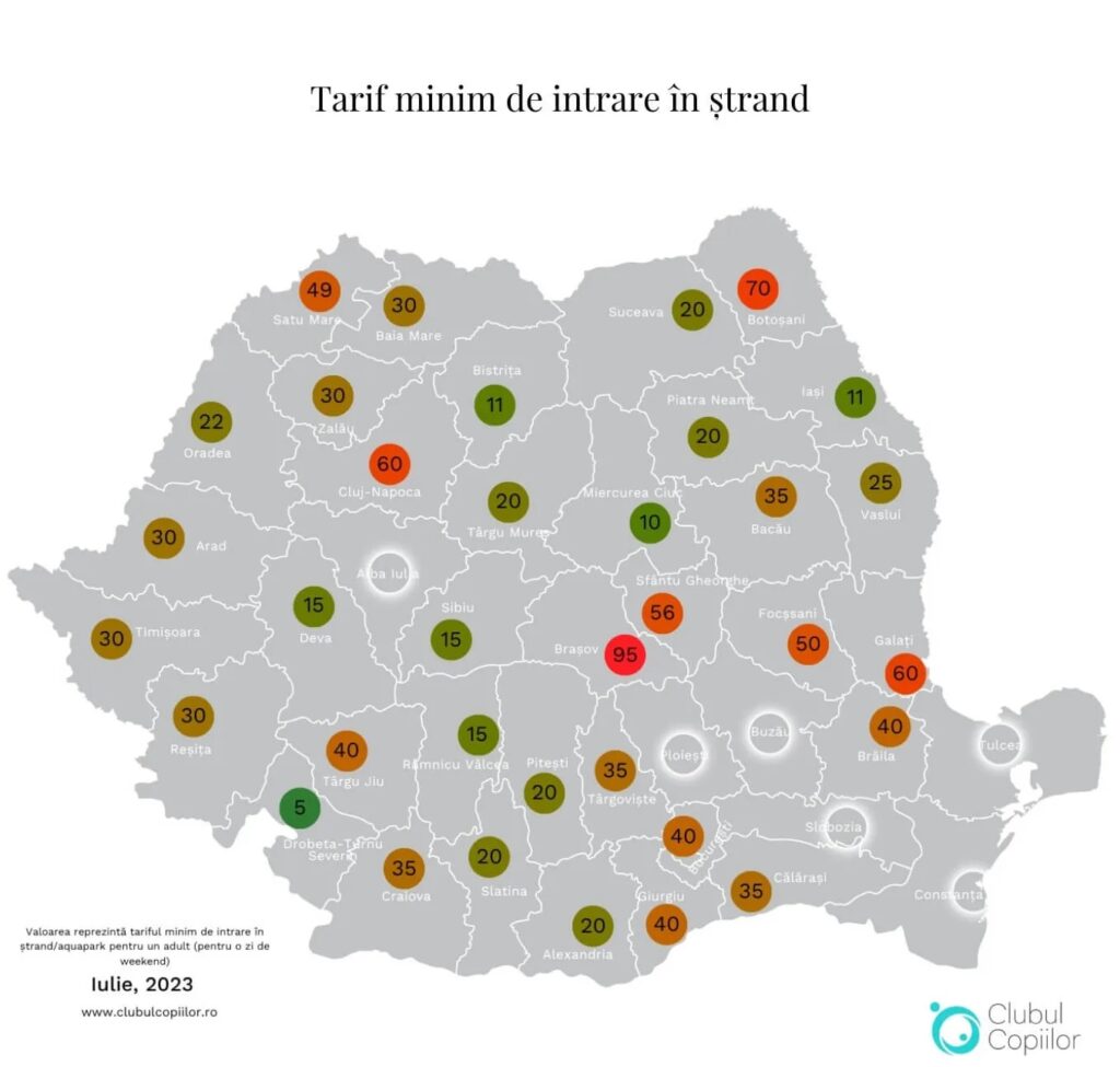 Au fost incluse în această analiză costurile de intrare pentru o zi de weekend la ștrandurile sau aquapark-urile din toate orașele reședință de județ din țară. În orașele în care oferta locală este variată, a fost selectat ștrandul cu cel mai mic preț de intrare.