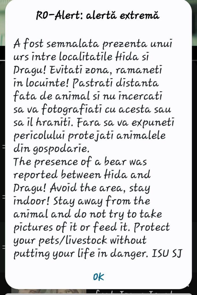 ”A fost semnalată prezența unui urs între localitățile Hida și Dragu” Evitați zona, rămâneți în locuințe! Păstrați distanța față de animal și nu încercați să vă fotografiați cu acesta sau să îl hrăniți. Fără să vă expuneți pericolului protejați animalele din gospodărie”, a fost mesajul transmis luni de Inspectoratul pentru Situații de Urgență Sălaj.