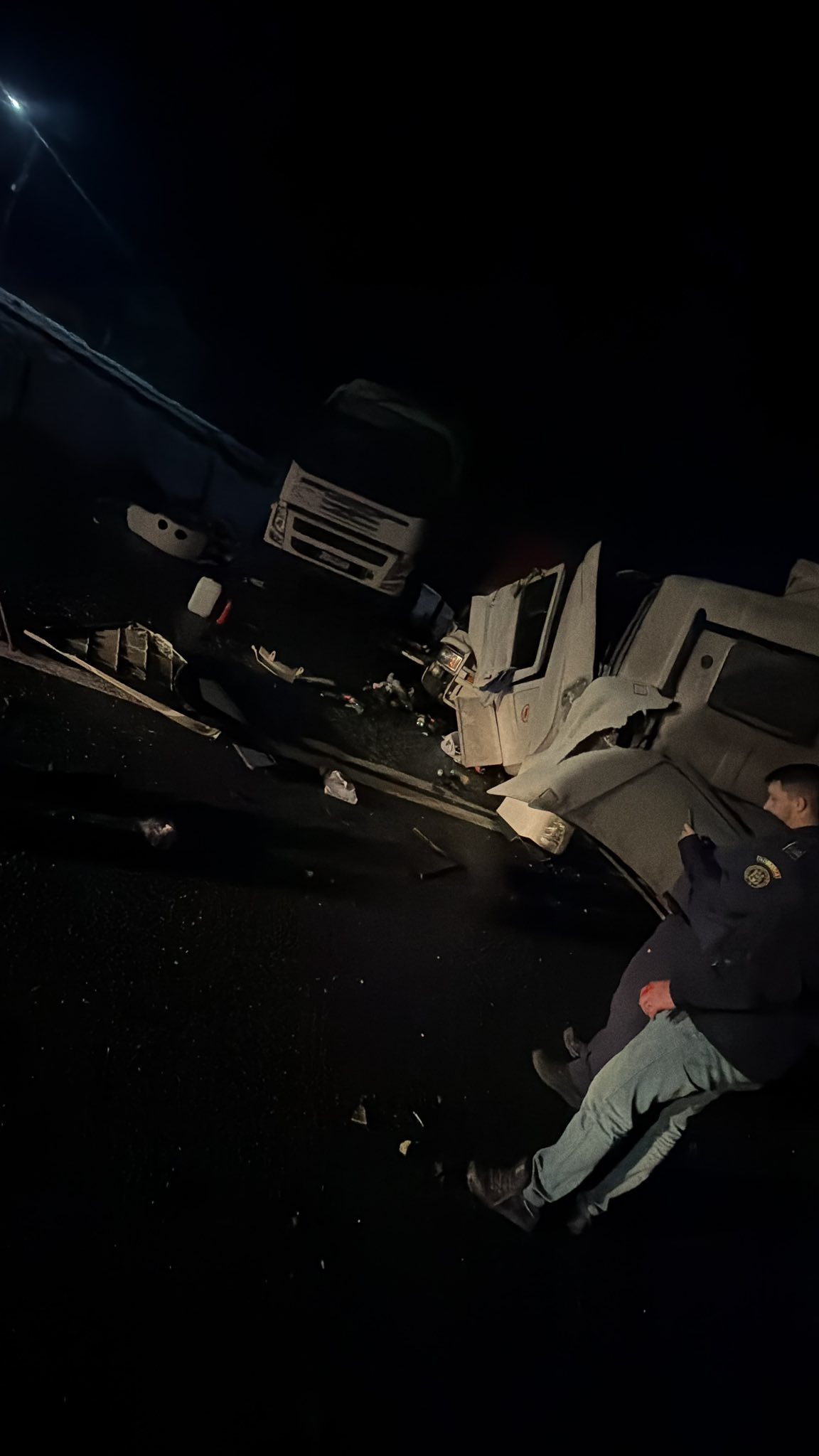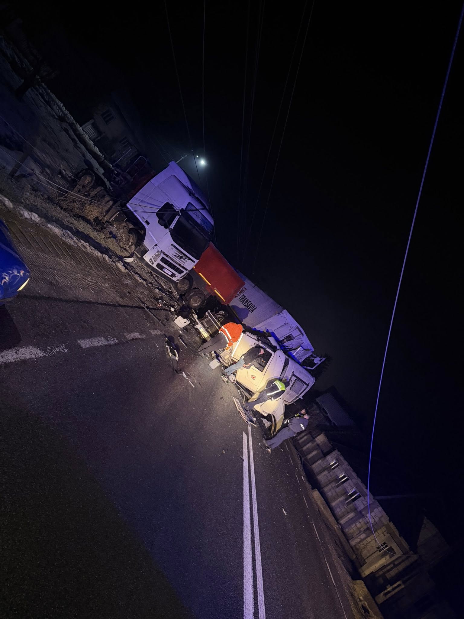 Potrivit primelor date ale Poliţiei, un autocamion ar fi derapat, acroșat un alt autocamion care se afla staționat în afara părții carosabile.