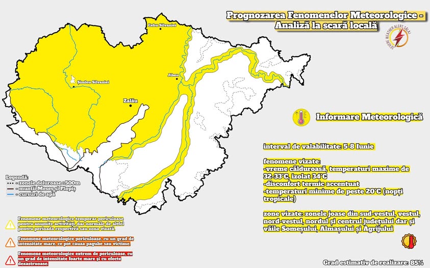 Începând de joi și până duminică, inclusiv, în zonele joase din vestul, nordul și centrul județului, dar și văile principale din estul județului (Someșului, Almașului și Agrijului) vremea va fi călduroasă, cu temperaturi maxime de 32-33°C, izolat 34°C (posibil cu totul izolat chiar 35°C, Duminică, în zonele joase din vestul județului).