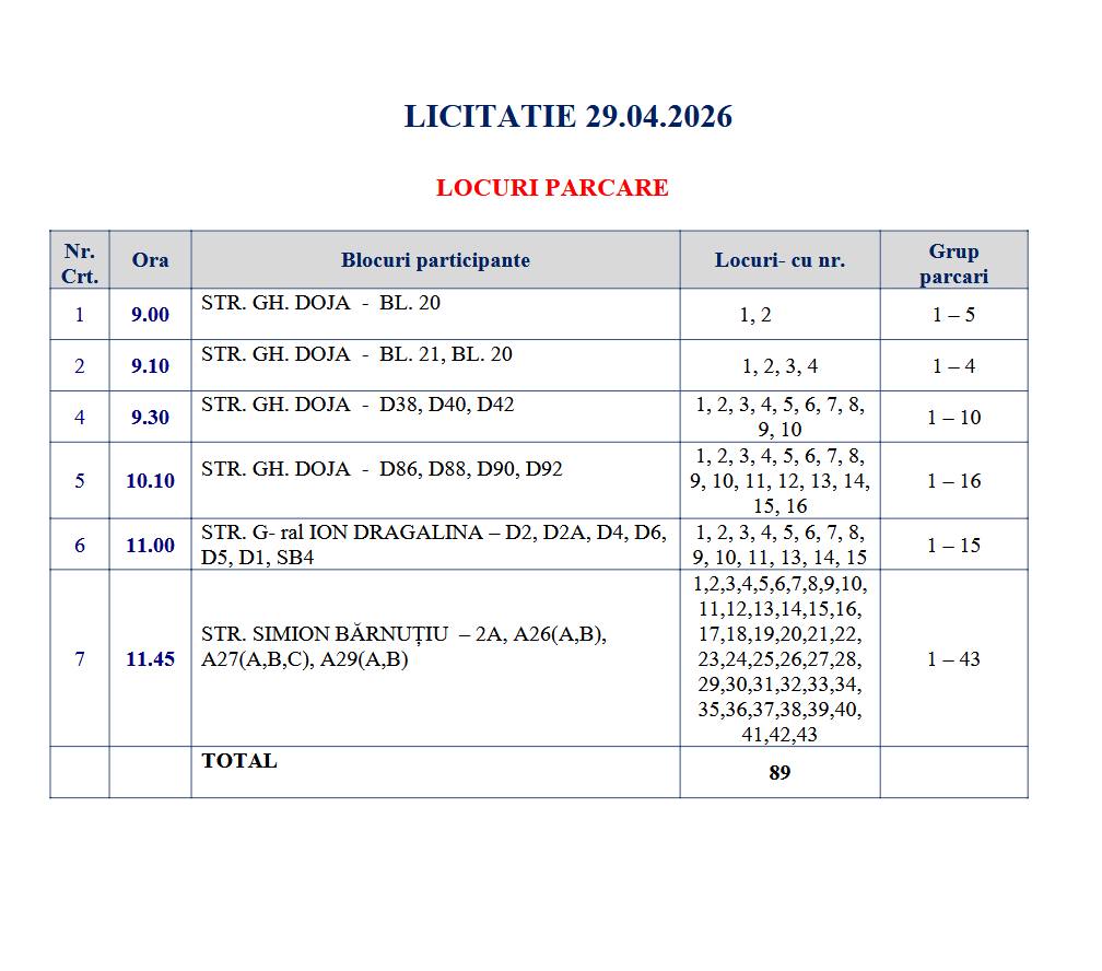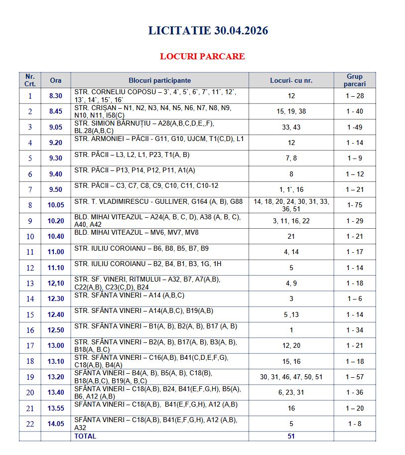 În prima zi a licitației, pe 29 aprilie, vor fi scoase la licitație 89 de locuri de parcare situate pe străzile Gheorghe Doja, Simion Bărnuțiu și General Ion Dragalina. Procesul va continua în data de 30 aprilie cu restul de 51 de locuri, repartizate pe străzile Corneliu Coposu, Crișan, Simion Bărnuțiu, Armoniei, Păcii, Tudor Vladimirescu, Bulevardul Mihai Viteazul, Iuliu Coroianu, Sfânta Vineri și Ritmului. Programul complet în imaginile ataşate: