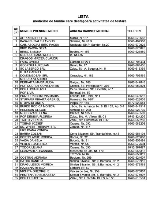 Pe noua listă apar 4 medici din Zalău, 3 medici din Șimleu Silvaniei, 2 medici din Cehu Silvaniei, un medic din Jibou.