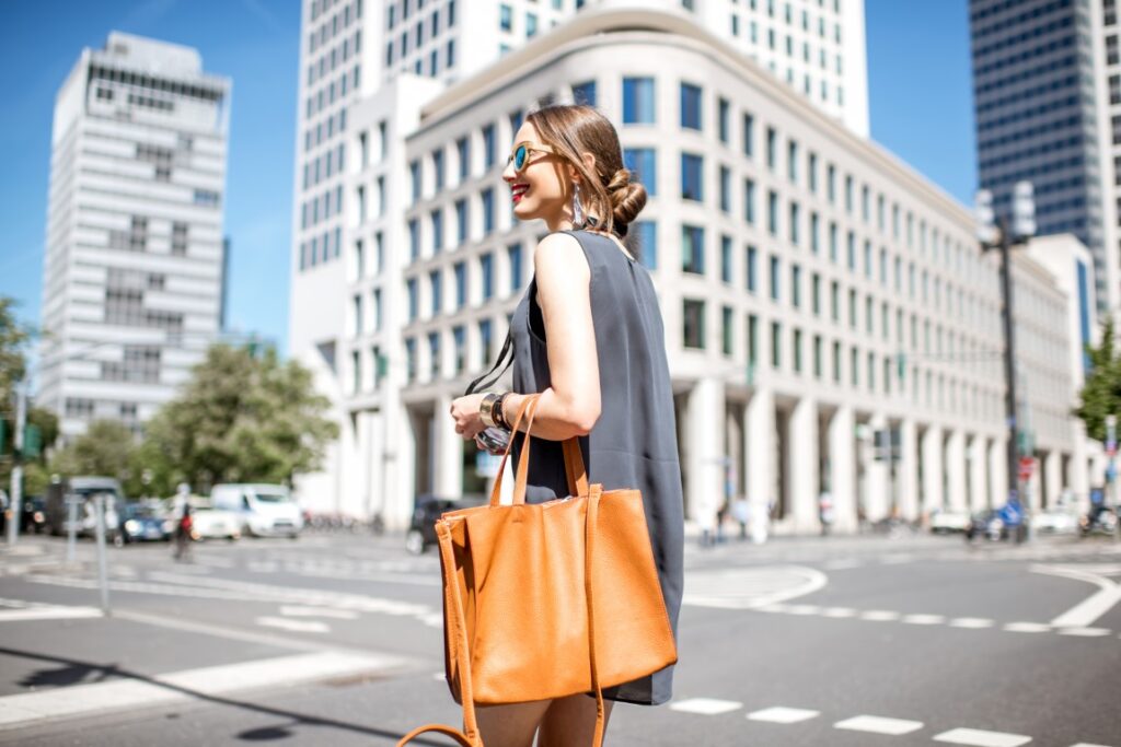 Lifestyle portrait of a businesswoman tourist walking with camera in the modern district in Frankfurt city