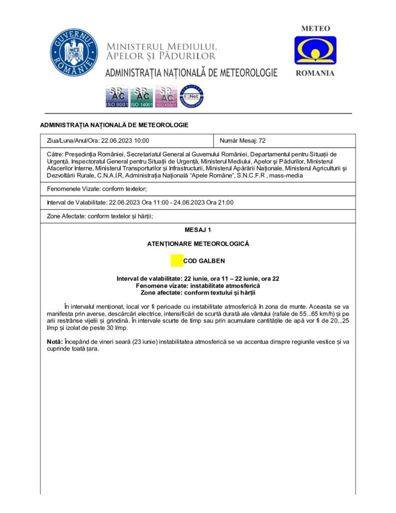 Astfel, până pe 22 iunie, la ora 22:00, local vor fi perioade cu instabilitate atmosferică în zona de munte. Vor avea loc averse, însoțite de descărcări electrice, intensificări de scurtă durată ale vântului, cu rafale ce vor sufla cu până la 65 de kilometri pe oră. Pe arii restrânse, se vor manifesta și vijelii, însoțite de grindină.