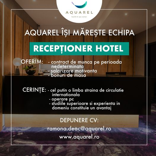 𝐀𝐐𝐔𝐀𝐑𝐄𝐋 își mărește echipa! Căutăm 𝐑𝐞𝐜𝐞𝐩𝐭̦𝐢𝐨𝐧𝐞𝐫 𝐇𝐨𝐭𝐞𝐥!