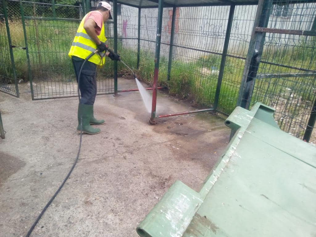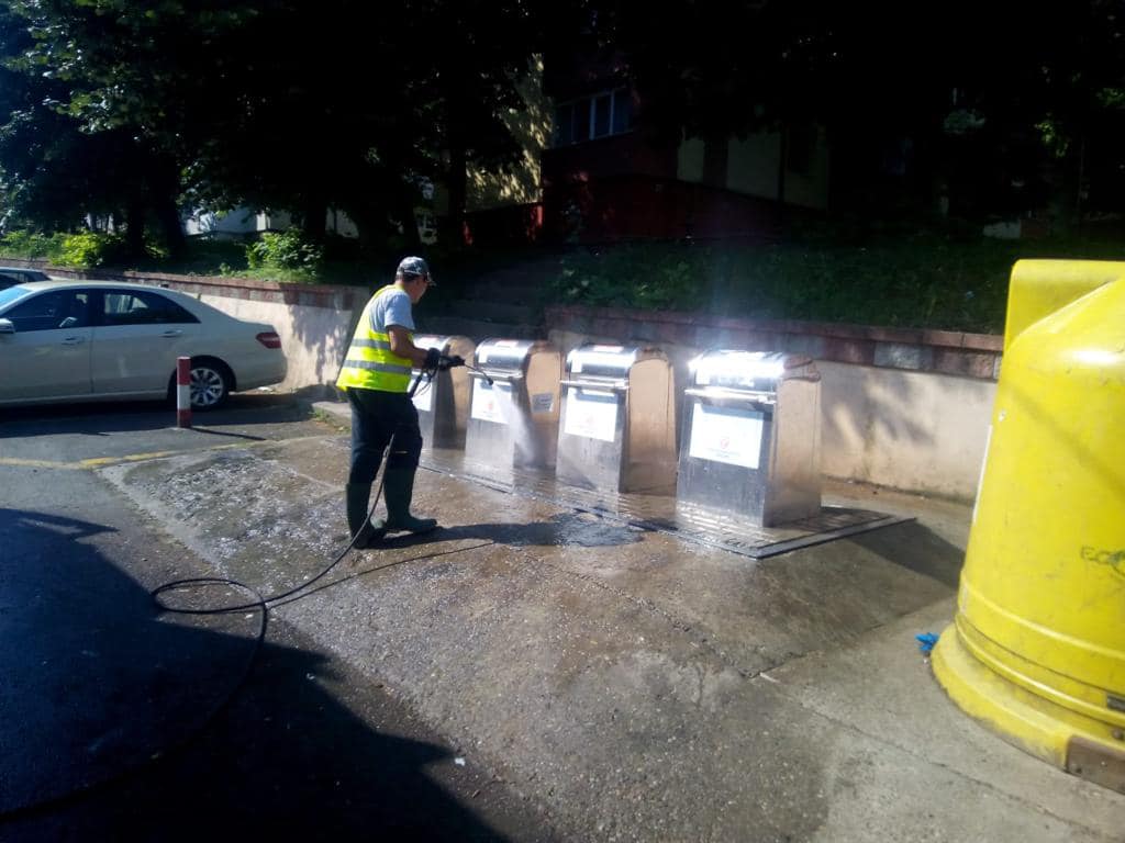 „Pentru acțiunea de igienizare se utilizează un echipament special la presiune foarte înaltă și cu dezinfectant. Sistemul de spălare are un rezervor de apă cu două compartimente, dintre care unul destinat colectării apei murdare, iar celălalt spălării cu apa curată, fiecare container fiind spălat și clătit individual”, explică administrația locală.