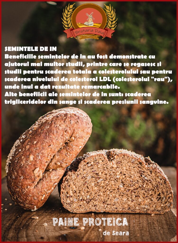 ”Pâinea proteică de seară este o pâine săracă în carbohidrați, cu puține glucide și multe proteine. Este o pâine bogată în semințe, cu o textură specială a miezului și o coajă crocantă, dar mai ales cu un gust special. Conține malț, semințe de in și semințe de floarea soarelui și NU conține făină albă. Beneficiile semințelor de in au fost demonstrate cu ajutorul mai multor studii, printre care se regăsesc scăderea totală a colesterolului sau pentru scăderea nivelului de colesterol LDL (colesterolul „rău”). Alte benefiicii ale semințelor de in sunt scăderea trigliceridelor din sânge și scăderea presiunii sanguine. Este o pâine nouă pentru cerințe moderne de limentație”, descrie Lăcrimioara Nagy cel mai nou produs.