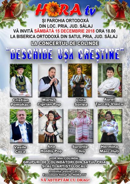Hora TV si Parohia ortodoxa Pria organizeaza sambata, 15 decembrie, la ora 18.00, spectacolul de colinde tradiaionale „Deschide usa, crestine!“, care va avea loc la biserica ortodoxa din satul Pria, comuna Cizer.