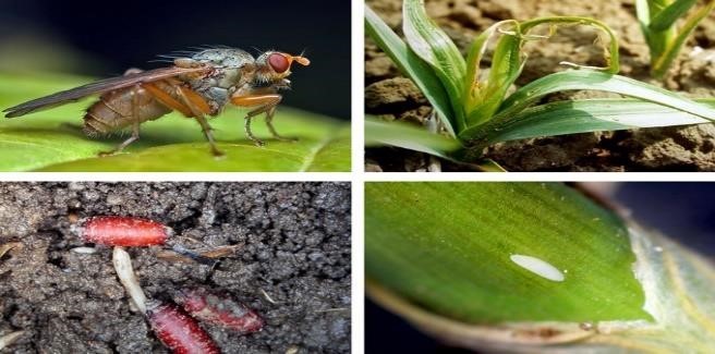 SUILLIA LURIDA (musca usturoiului) – are o singura generatie pe an. Ierneaza in stadiul de adult in resturile vegetale, sau in bulgarii de pamant, iar primavara devreme parasesc locurile de iernare, cautand plantele de usturoi pentru a depune ponta. Ouale sunt grupate si depuse pe sol in jurul plantelor sau chiar pe frunze. Dupa eclozare, larvele patrund in tulpinile de usturoi, fixandu-se la baza frunzei centrale, hranindu-se cu tesutul vegetal, apoi patrund in bulbi. Plantele stagneaza in crestere si prezinta frunze ofilite si ingalbenite. Frunza centrala este rasucita in forma de spirala. Bulbii atacati se inmoaie si putrezesc.