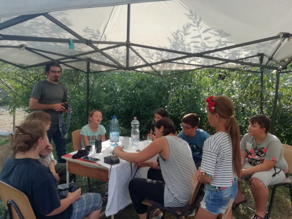 Revenind la modul în care am structurat atelierul. Am încercat să îmbin anumite noțiuni de bază ale fotografiei, adică noțiuni teoretice (diafragmă, timp de expunere, ISO, compoziția cadrului) cu practica. Le-am dat copiiilor aparate digitale și i-am lăsat să experimenteze, întâi în curte și apoi pe teren, mergând din când în când lângă ei și îndemându-I să modifice parametrii ca să înțeleagă practic impactul unei diafragme mai mari sau unui timp de expunere mai scurt.