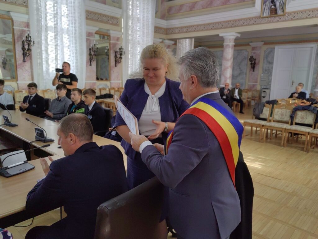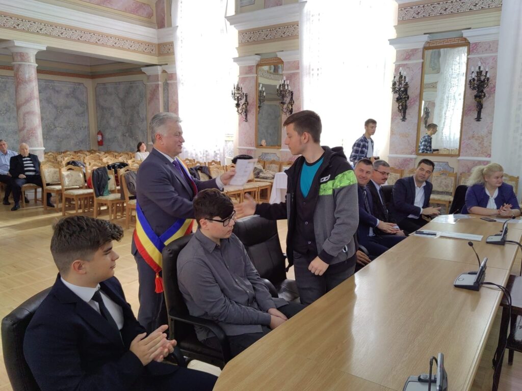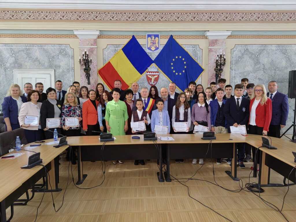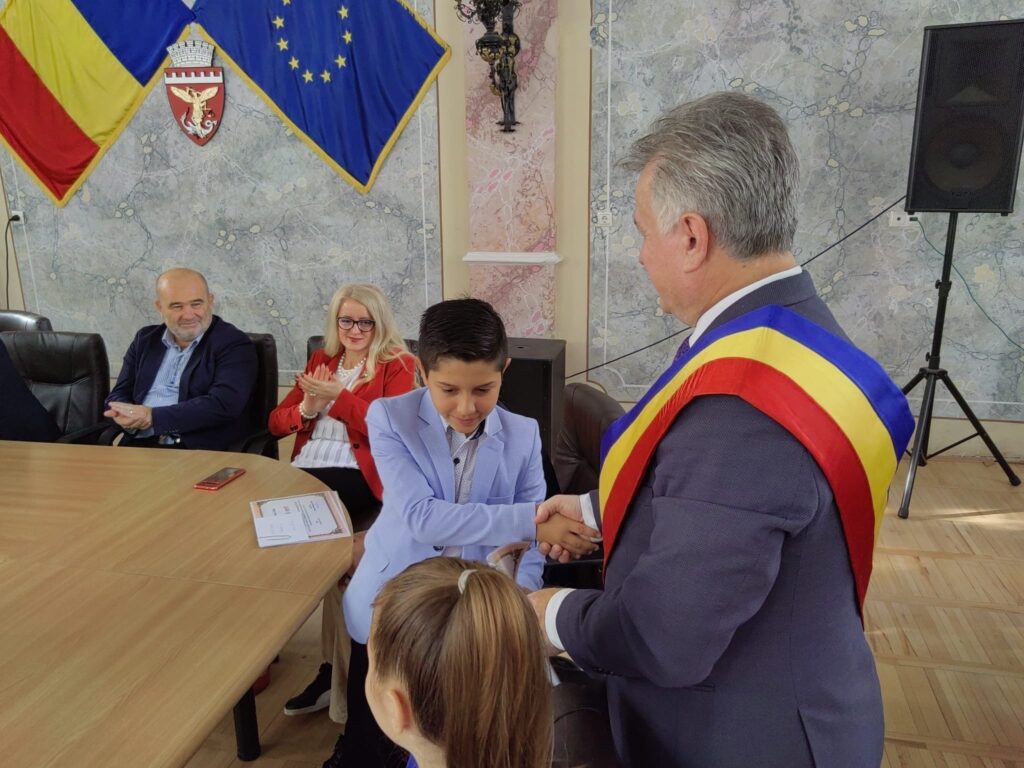 18 elevi cu rezultate excepționale la olimpiadele interjudețene, alături de directorii unităților de învățământ în care învață acești olimpicii, au fost premiați de primarul Ionel Ciunt, în numele administrației locale, cu ocazia Zilei Educației.