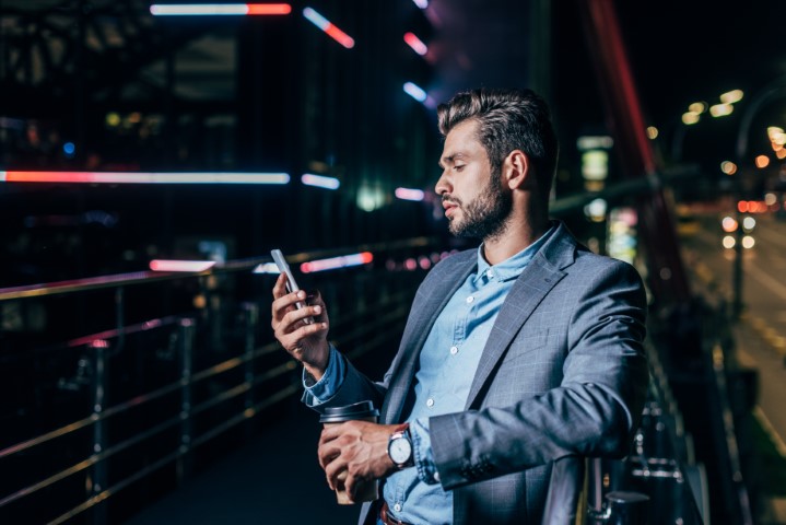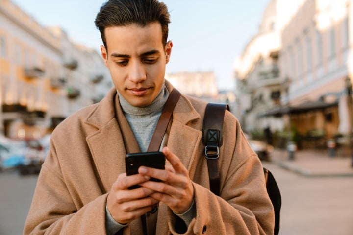 Young man wearing coat using mobile phone at city street outdoors