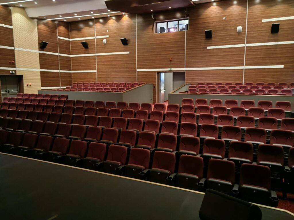 În noua sală este montat un ecran de 10 mp, iar poziţia scaunelor a fost reconfigurată în trei zone separate prin culoare de acces.